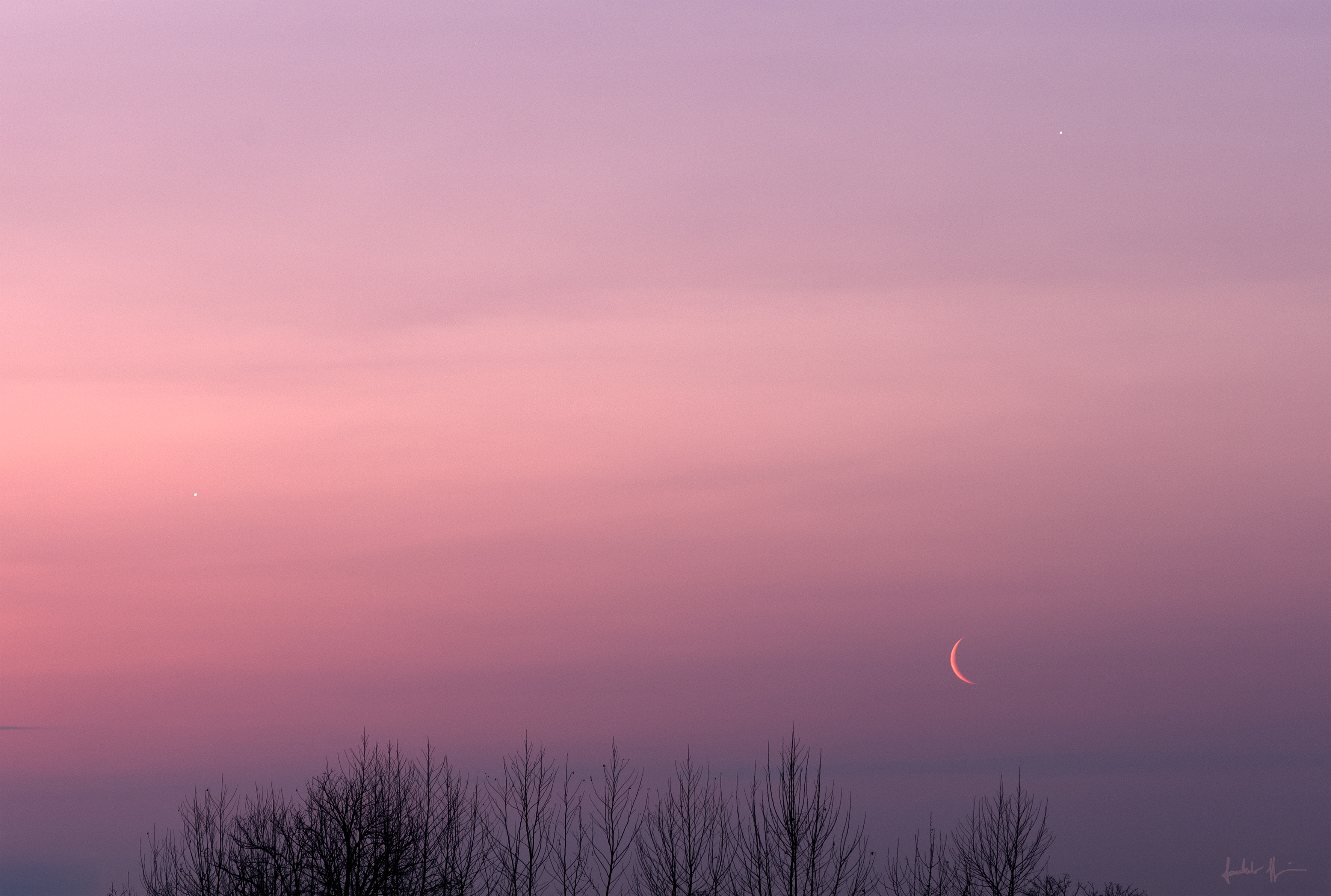 Sfida Luna-Giove-Saturno di Lamberto Sassoli. Una stupenda ripresa, al limite della visibilità della congiunzione tra la sottile falce di Luna e le prime apparizioni all'alba di Giove e Saturno. Per tutti i dettagli della ripresa cliccare sull'immagine. Crediti Coelum Astronomia/Lamberto Sassoli