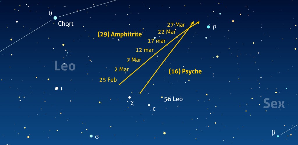 Nelle vicinanze sempre di Amphirite, potremo trovare anche (16) Psyche (mag. +10,26), meno luminoso ma i due asteroidi viaggeranno, prospetticamente, a poca distanza tra loro per incrociarsi negli ultimi giorni di marzo.