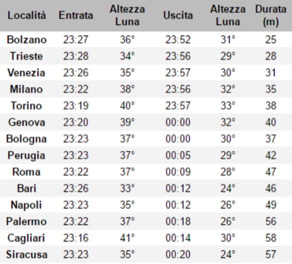 Particolarmente suggestivo sarà proprio vedersi “spegnere” la stella nel momento di ingresso nel lembo oscuro del nostro satellite, dal quale riemergerà dal lembo illuminato dopo un periodo che dipende dalla vostra zona di osservazione.