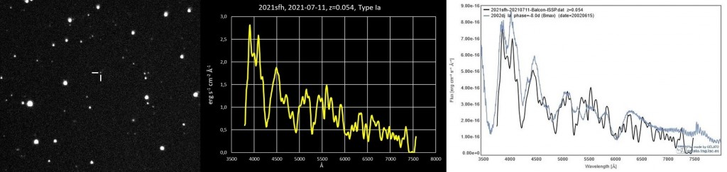 Il nuovo oggetto è apparso subito molto luminoso a mag. +15,7 ma situato molto vicino al nucleo, che in questa galassia è diviso in due da una scura striscia di polveri. Per la precisione la supernova è posta nella parte nordest del nucleo. Appena 13 ore dopo la scoperta, con il telescopio da 2,5 metri del Caucasus Mountain Observatory in Russia, è stato ottenuto lo spettro di conferma. La SN2021rhu, questa la sigla definitiva assegnata, è una supernova di tipo Ia scoperta circa due settimane prima del massimo di luminosità, con i gas eiettati dall’esplosione che viaggiano a una velocità di circa 16.000 km/s. Il massimo di luminosità è stato infatti raggiunto intorno al 16 luglio con la supernova che ha raggiunto la notevole mag.+12,1.