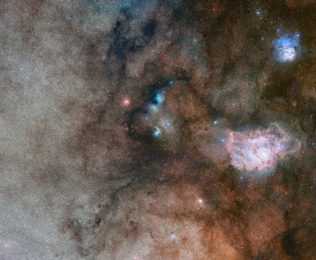 Quando la polvere e il gas interstellari sono bombardati dalla luce ultravioletta emessa da stelle calde e giovani, l’energia le fa brillare luminose. La luce diffusa e rossastra che permea l’immagine proviene dall’emissione di idrogeno gassoso, mentre la luce blu scintillante è causata dalla riflessione e diffusione prodotta da piccole particelle di polvere. Oltre a emissione e riflessione, vediamo anche zone di assorbimento in questa regione. Brandelli di polvere bloccano la luce nel suo cammino verso di noi, impedendoci di vedere le stelle dietro di essi, mentre tentacoli sottili di polvere creano le strutture filamentose scure all’interno delle nubi.