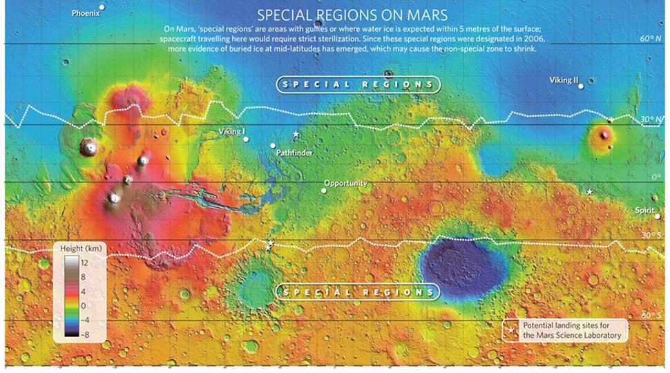 Sono state identificate alcune regioni di Marte chiamate “regioni speciali”. Luoghi in cui gli organismi terrestri possono essere in grado di replicarsi, o dove c’è un’alta probabilità di trovare vita marziana. Allo stato attuale le regioni speciali sono definite come aree all’interno delle quali l’attività dell’acqua è alta e in cui si trovano temperature medio-calde. Queste condizioni possono trovarsi, sulla Terra, in grotte o cavità, ovvero in nicchie in cui la vita si è annidata. La missione ExoMars che verrà lanciata lunedì prossimo atterrerà nella regione Meridiani Planum studiando l’atmosfera marziana grazie allo strumento DREAMS realizzato tra Napoli e Padova (Principal Investigator Francesca Esposito, INAF – Osservatorio Astronomico di Capodimonte – ndr). Ad ogni modo, il modulo di atterraggio (EDM), nonostante abbia subito tutte le procedure di sterilizzazione, non verrà a contatto con le regioni speciali.