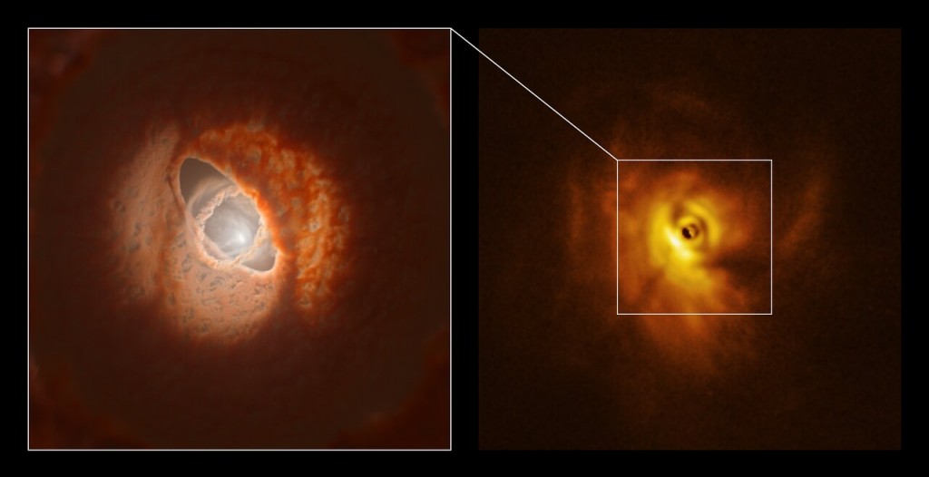 I ricercatori hanno osservato il sistema anche con lo strumento SPHERE sul VLT dell’ESO e con ALMA, di cui l’ESO è un partner, e sono stati in grado di visualizzare l’anello interno e confermare il suo disallineamento. SPHERE dell’ESO ha anche permesso loro di vedere, per la prima volta, l’ombra che questo anello proietta sul resto del disco, fatto che ha aiutato a capire la forma tridimensionale dell’anello e del disco in generale.