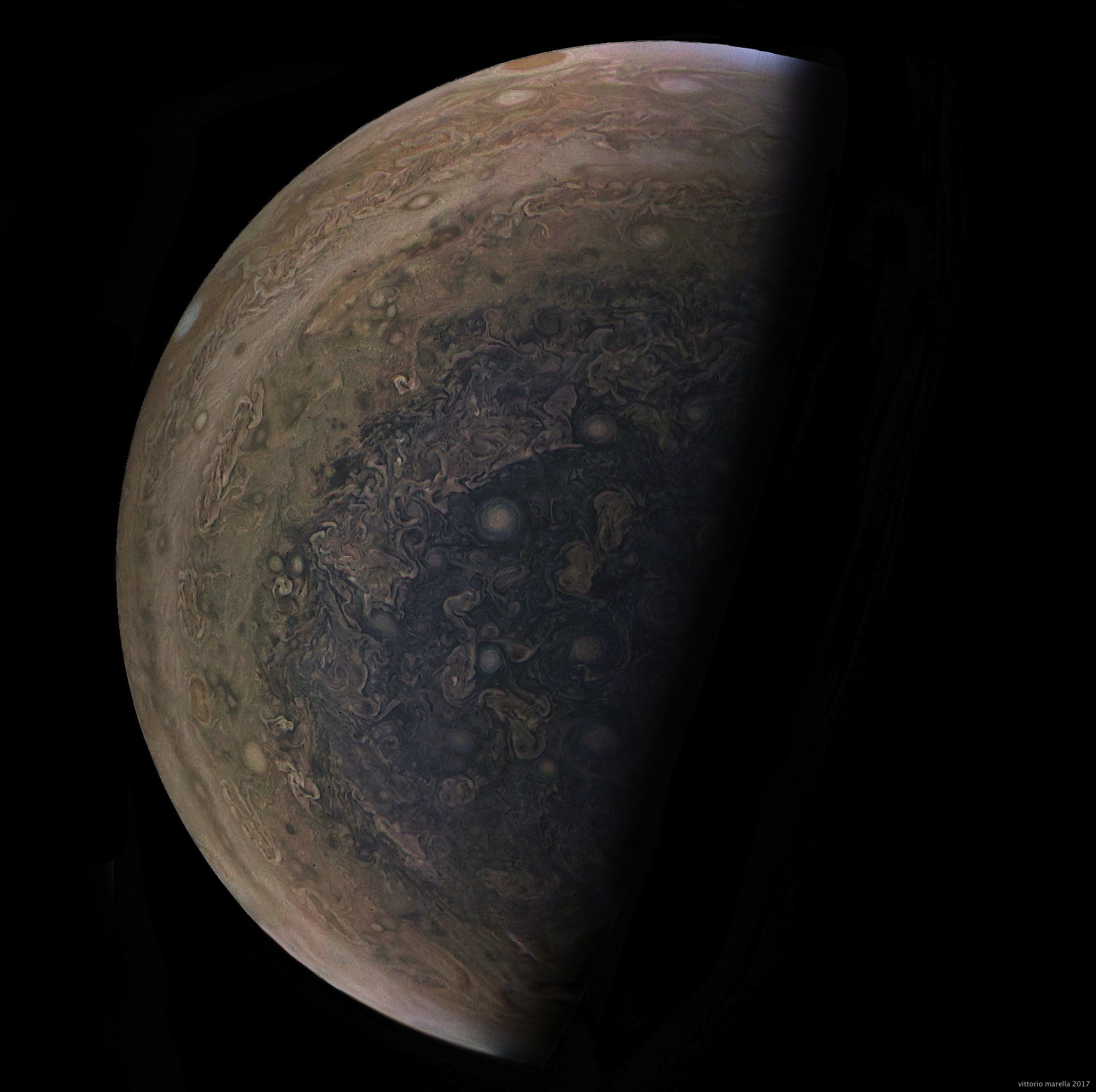 La sonda della NASA Juno ha ripreso questa immagine grazie alla JunoCam, la camera dedicata alle riprese per il grande progetto di Citizen science lanciato per seguire la missione. L’immagine è stata ripresa l’11 dicembre scorso, ed è stata poi elaborata da Sergey Dushkin, che ha ritagliatol’immagine, e ne ha magistralmente calibrato i colori, per sottolineare la dinamicità delle nuvole di quella zona.