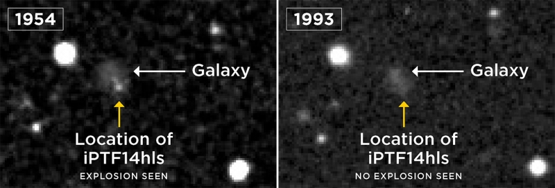 Tutto comincia, o meglio, ricomincia, nel settembre del 2014. Quando un team d’astronomi della Intermediate Palomar Transient Factory – una survey automatizzata per intercettare eventi transienti in banda ottica – registra un’esplosione a mezzo miliardo d’anni luce da noi. L’analisi spettrale rivela che si tratta d’una supernova II-P, ma ha qualcosa di strano: invece dei circa 100 giorni che di norma trascorrono prima che la luce di supernove di questo tipo s’estingua, l’impronunciabile iPTF14hls non vuole saperne di spegnersi e continua a brillare per oltre 600 giorni. Incuriositi, gli astronomi la studiano con attenzione, vanno pure a spulciare gli archivi della Palomar Sky Survey. E salta fuori che lì, in quel punto esatto della costellazione dell’Orsa Maggiore, già c’era stata un’altra esplosione. Quando? Nel 1954.