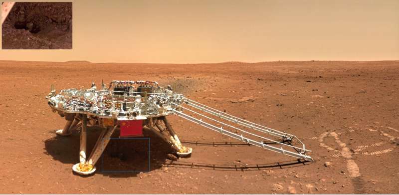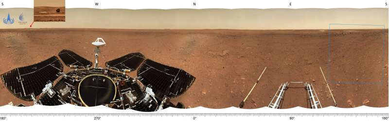 Ecco infine una bella panoramica a 360° ripresa dal rover quando era ancora sopra la piattaforma di atterraggio. Nell’inserto vediamo, ingrandito, il guscio superiore e il paracadute, posati a 350 metri di distanza e fotografati anche dagli orbiter Tianwen-1 e MRO. Il riquadro in azzurro evidenzia la regione inquadrata nella foto precedente, in modo indicativo dato che il punto di ripresa non è lo stesso.