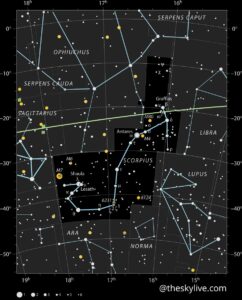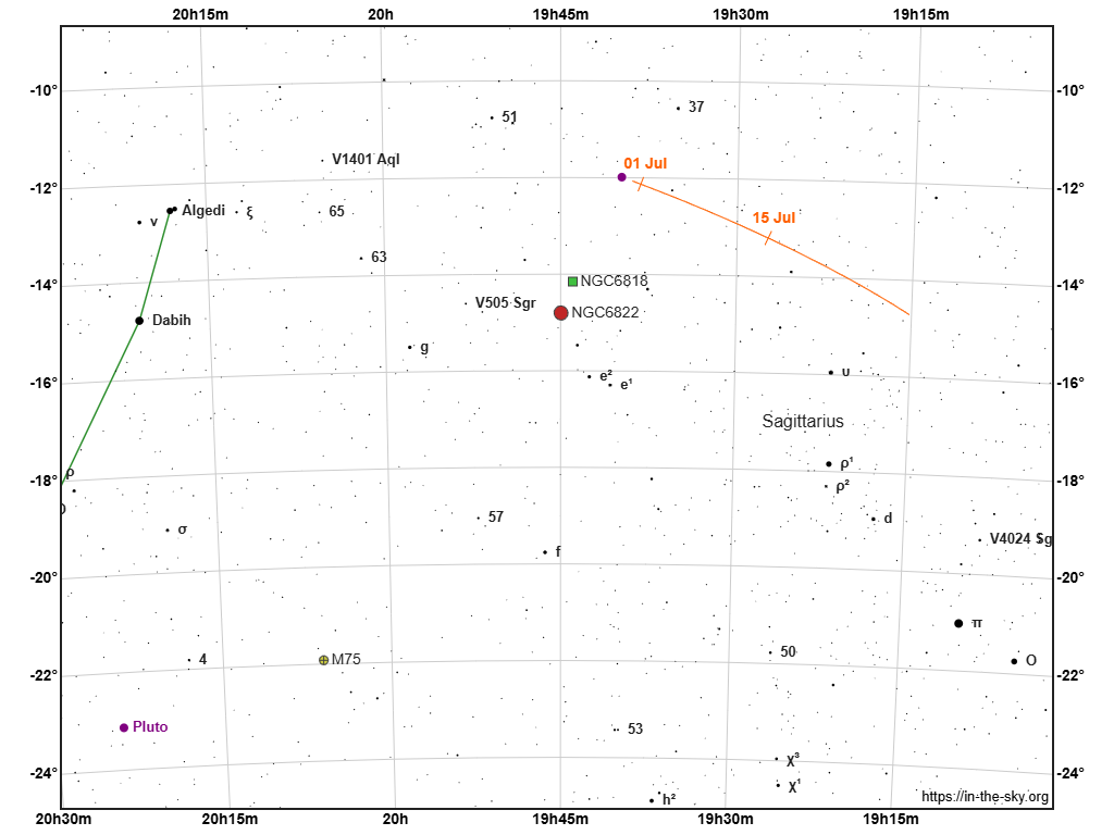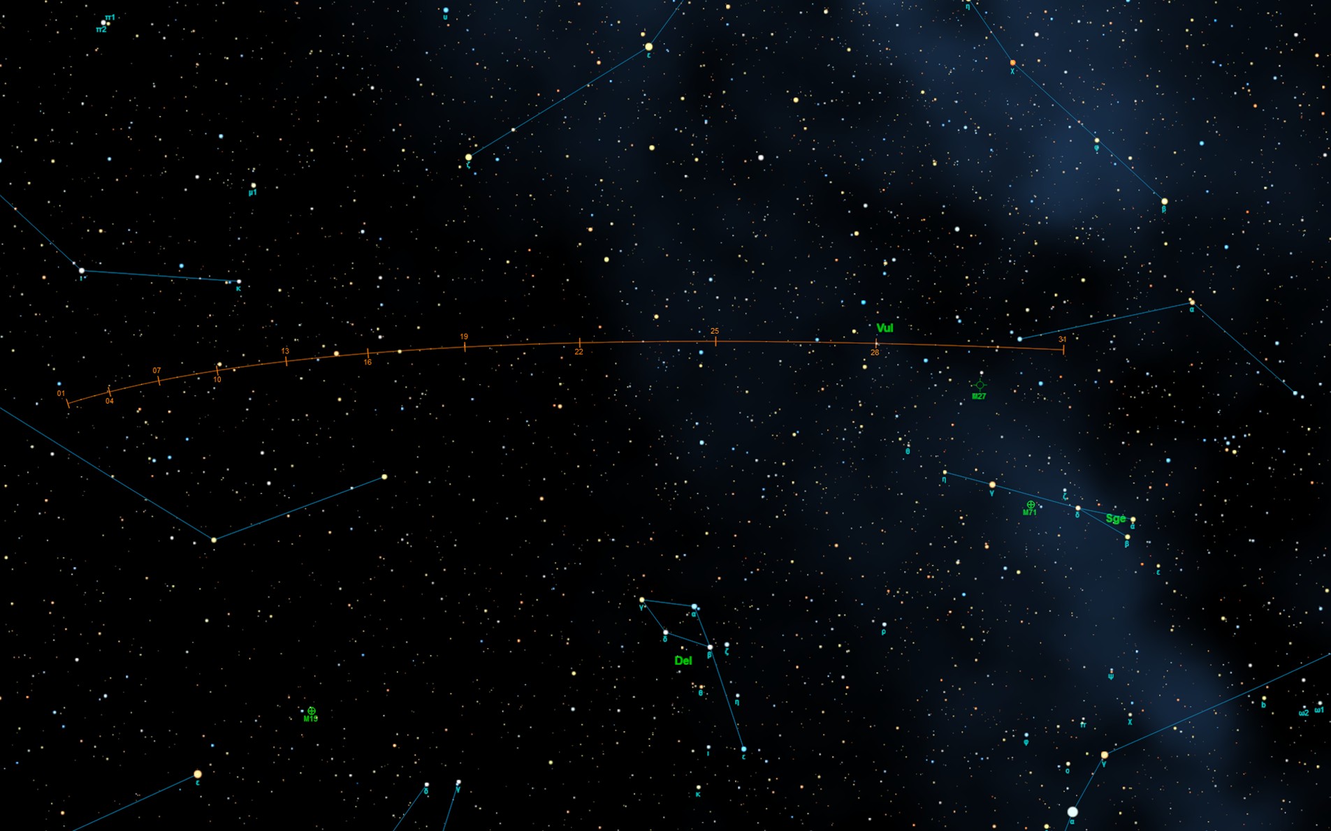 Messier 24 si può rintracciare seguendo la “cima” dell’asterismo a forma di “teiera” nel Sagittario e spostarsi fino alla stella μ (Mu) Sagittarii (Polis – Al Thalimain – Alnam). Questa struttura si troverà a circa due-quattro gradi verso N dall’astro.