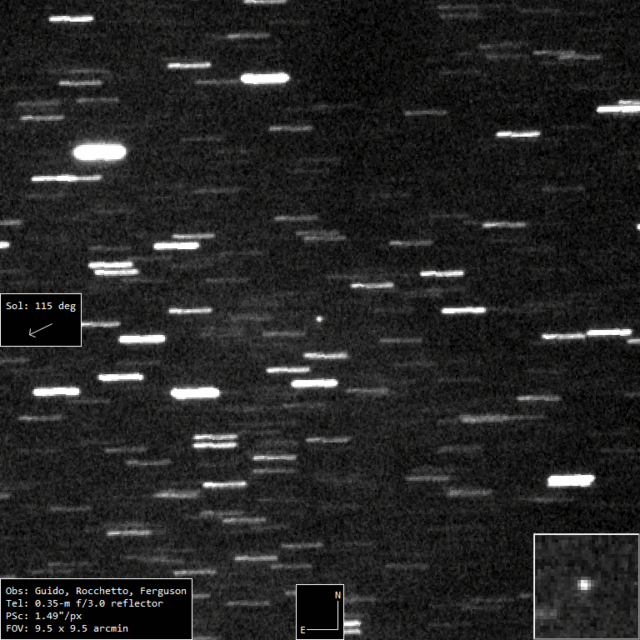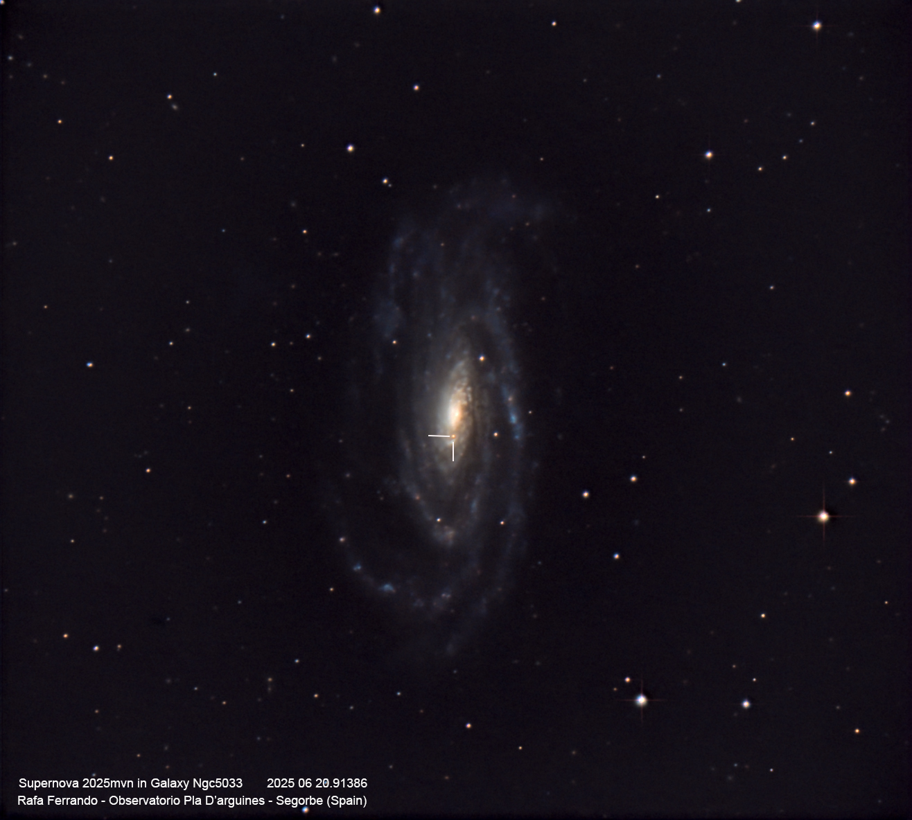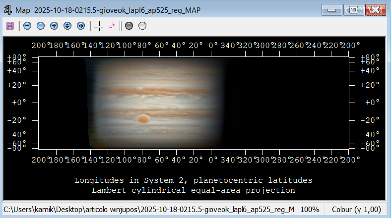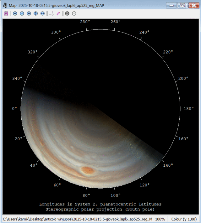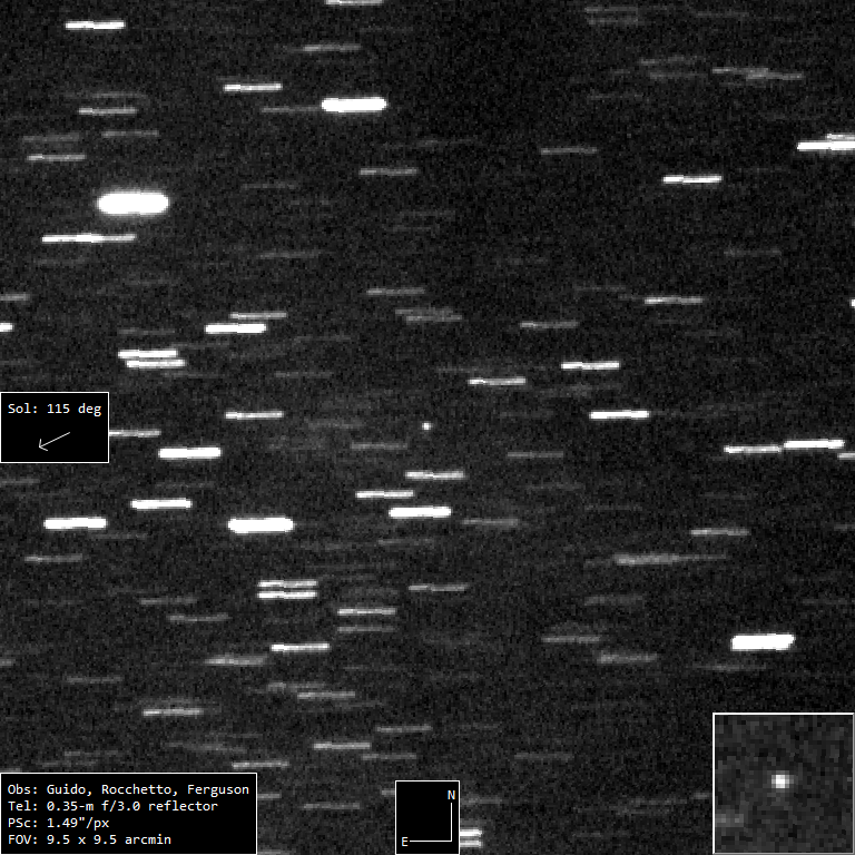 L’oggetto in questione si trova nelle vicinanze della posizione RA 18h 20m 46.16s, DEC -13° 45′ 27.3″ (J2000), in un campo stellare abbastanza denso, immerso in emissioni di idrogeno ionizzato. Nella composizione RGB e nei singoli canali (R, G, B), la fonte luminosa appare debole ma è identificabile e sbilanciata verso il rosso. Nel canale OIII si osserva invece una maggiore e marcata luminosità se paragonata alle stelle del campo, mentre nei canali SII e Hα l’intensità è meno marcata. Le immagini in figura 2 rappresentano un confronto qualitativo tra le varie bande nelle osservazioni di Federico di giugno 2025.