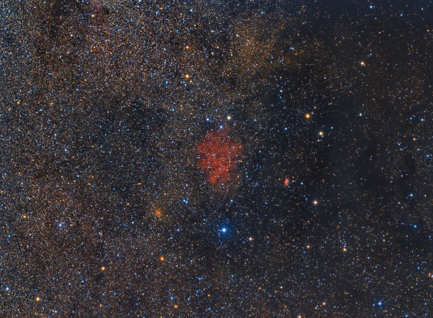 Accanto a NGC 6603 si trovano anche due nebulose oscure molto note: Barnard 92 e Barnard 93, che appaiono come aree completamente prive di stelle, poste rispettivamente sul bordo nord-occidentale e nord-orientale della nube. La loro presenza accentua il contrasto con lo sfondo ricco di stelle, conferendo a M24 un aspetto quasi tridimensionale. Oltre a questi, la nube ospita anche due nebulose planetarie (NGC 6567 e M 1-43) e piccoli ammassi aperti come Collinder 469 e Markarian 38, rendendo M24 una delle regioni più complesse e affascinanti del cielo boreale estivo.