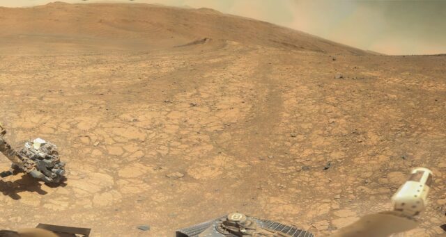 Sol 1597, visuale NavCam dell’affioramento Soroya che in questa fotografia si sviluppa verso sud-ovest. NASA/JPL-Caltech/Piras.