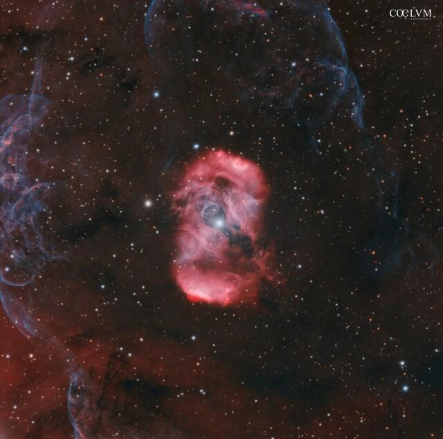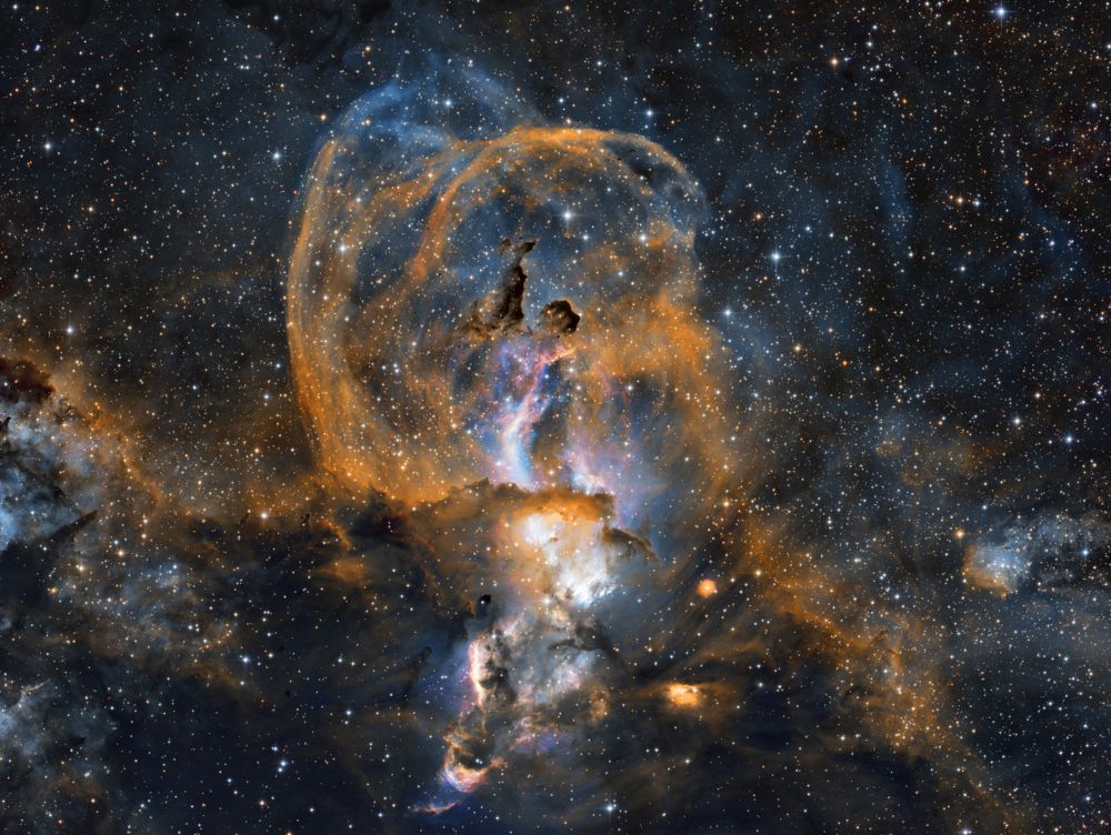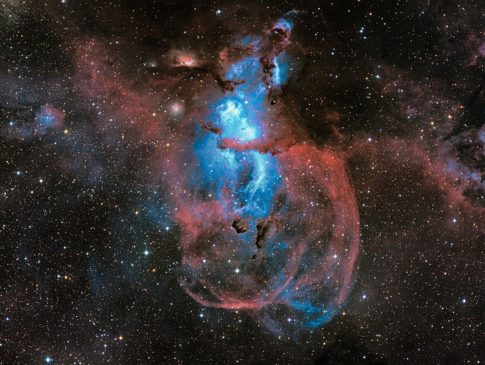 L'immagine ripresa dal Very Large Telescope (VLT) dell'ESO mostra il resto di supernova SNR 0509-67.5, formato da materiale in espansione ad alta velocità, espulso in seguito alla doppia esplosione di una nana bianca. Lo strumento MUSE installato sul VLT ha permesso di mappare la distribuzione di vari elementi chimici nel resto. In particolare, il calcio è mostrato in blu e forma due gusci concentrici, mentre l'idrogeno è rappresentato in tonalità arancio.