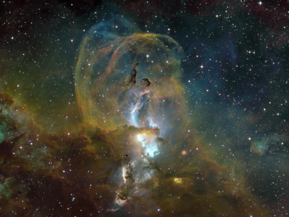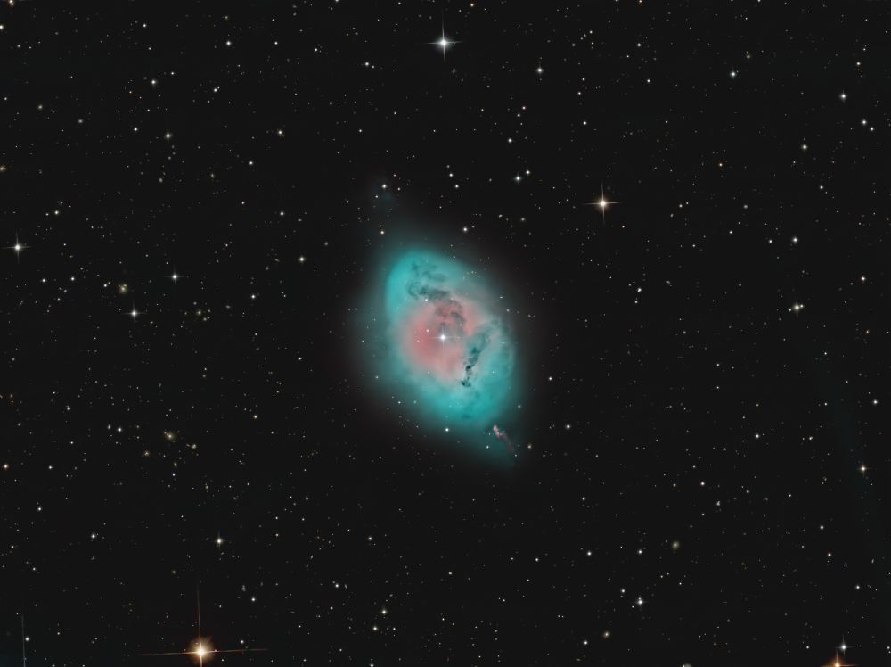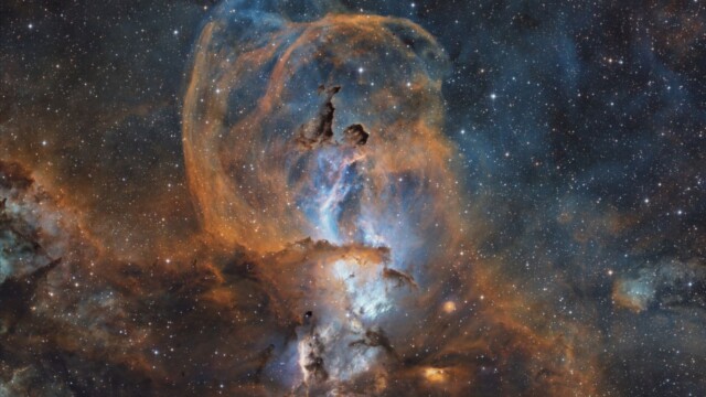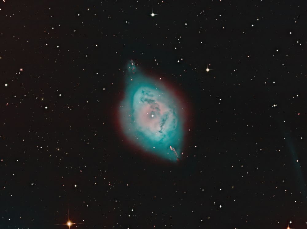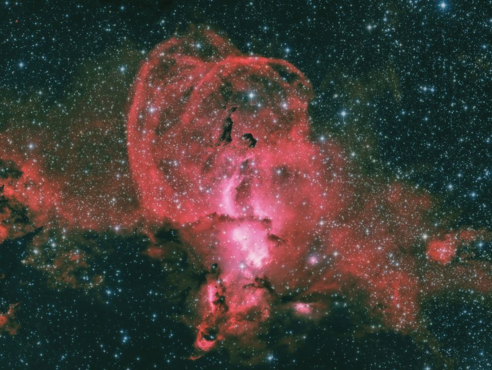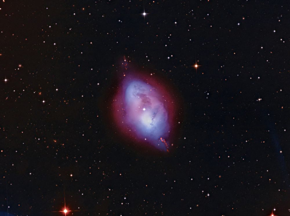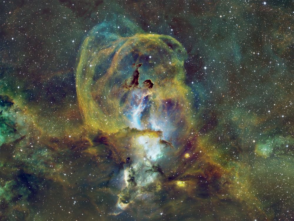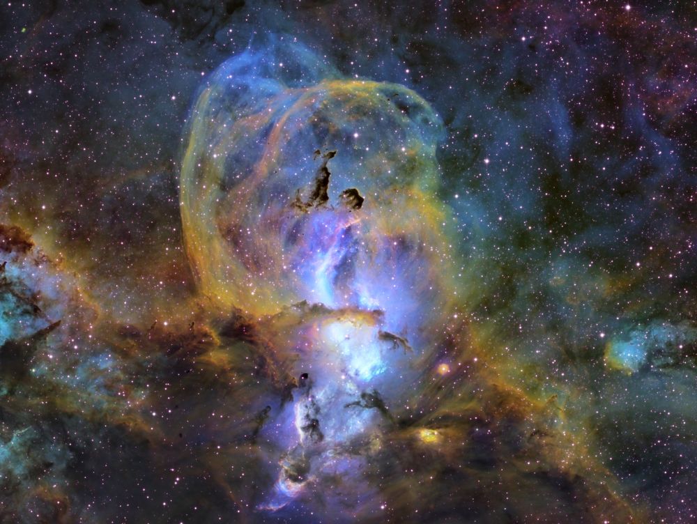 Nelle notti della prima settimana di Giugno, Federico ha realizzato una serie di riprese multibanda della famigerata nebulosa Aquila, al cui centro ci sono gli ancora più famosi Pilastri della Creazione, una struttura di gas ionizzato, polveri e giovani oggetti stellari immortalati decine di anni fa in una delle più celebri immagini del Telescopio Spaziale Hubble. Durante il montaggio dell’immagine in Hubble Palette (combinazione di riprese coi filtri SII, H-alpha e OIII) con stelle RGB, Federico si è accorto di uno strano oggetto in una delle due ali dell’Aquila, che in una sua precedente ripresa non aveva lo stesso aspetto (fig. 1).