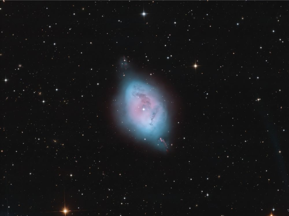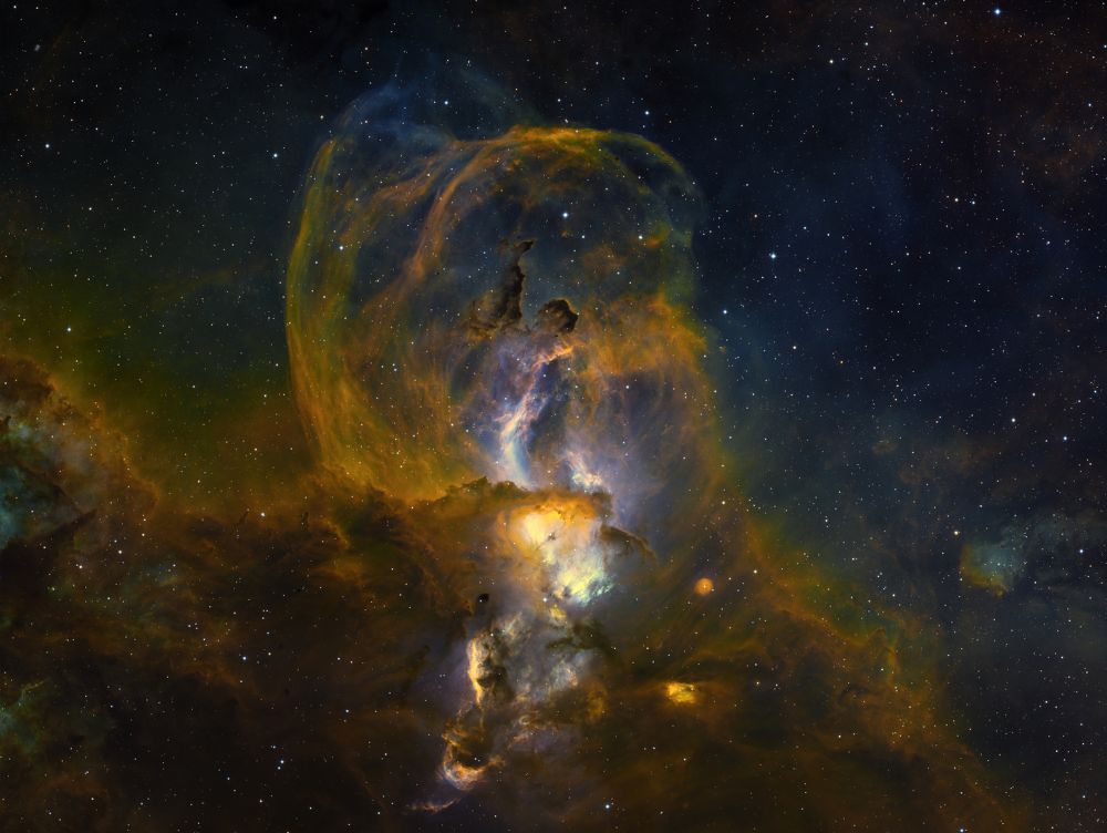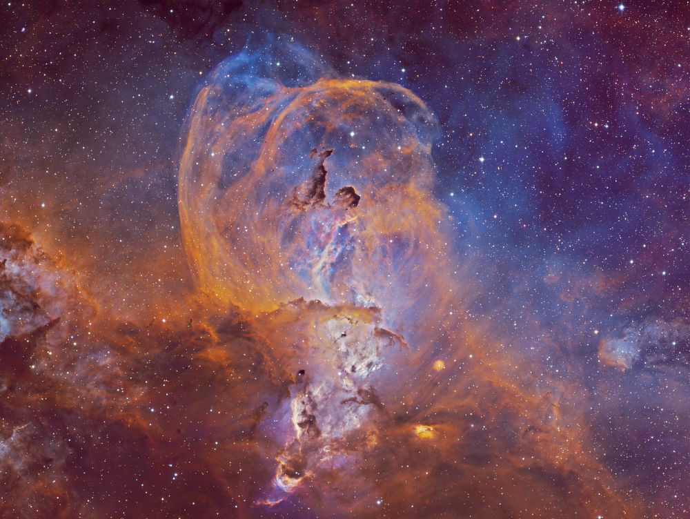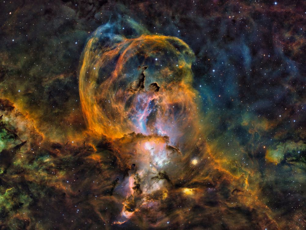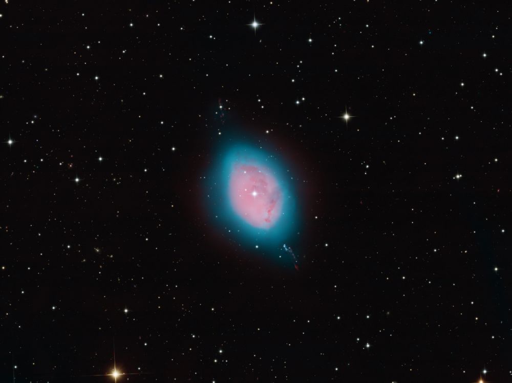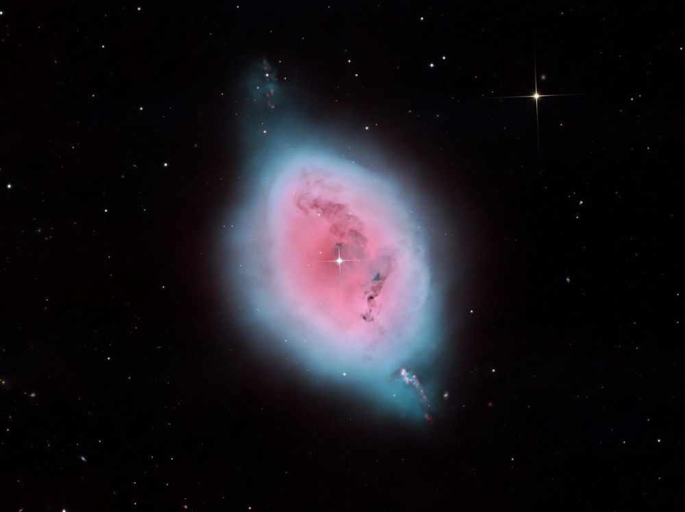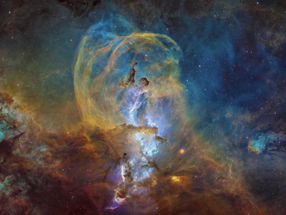 Nelle notti della prima settimana di Giugno, Federico ha realizzato una serie di riprese multibanda della famigerata nebulosa Aquila, al cui centro ci sono gli ancora più famosi Pilastri della Creazione, una struttura di gas ionizzato, polveri e giovani oggetti stellari immortalati decine di anni fa in una delle più celebri immagini del Telescopio Spaziale Hubble. Durante il montaggio dell’immagine in Hubble Palette (combinazione di riprese coi filtri SII, H-alpha e OIII) con stelle RGB, Federico si è accorto di uno strano oggetto in una delle due ali dell’Aquila, che in una sua precedente ripresa non aveva lo stesso aspetto (fig. 1).