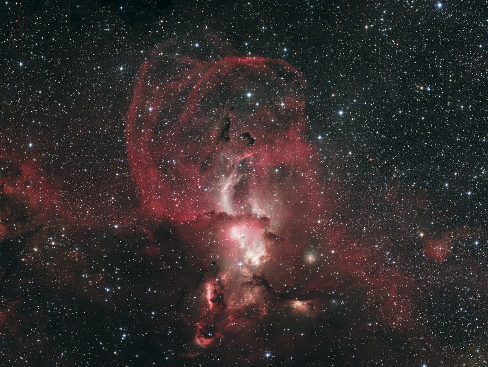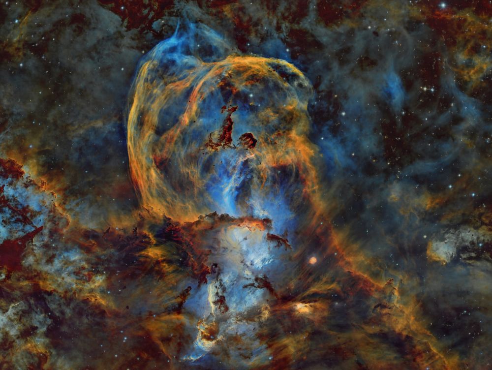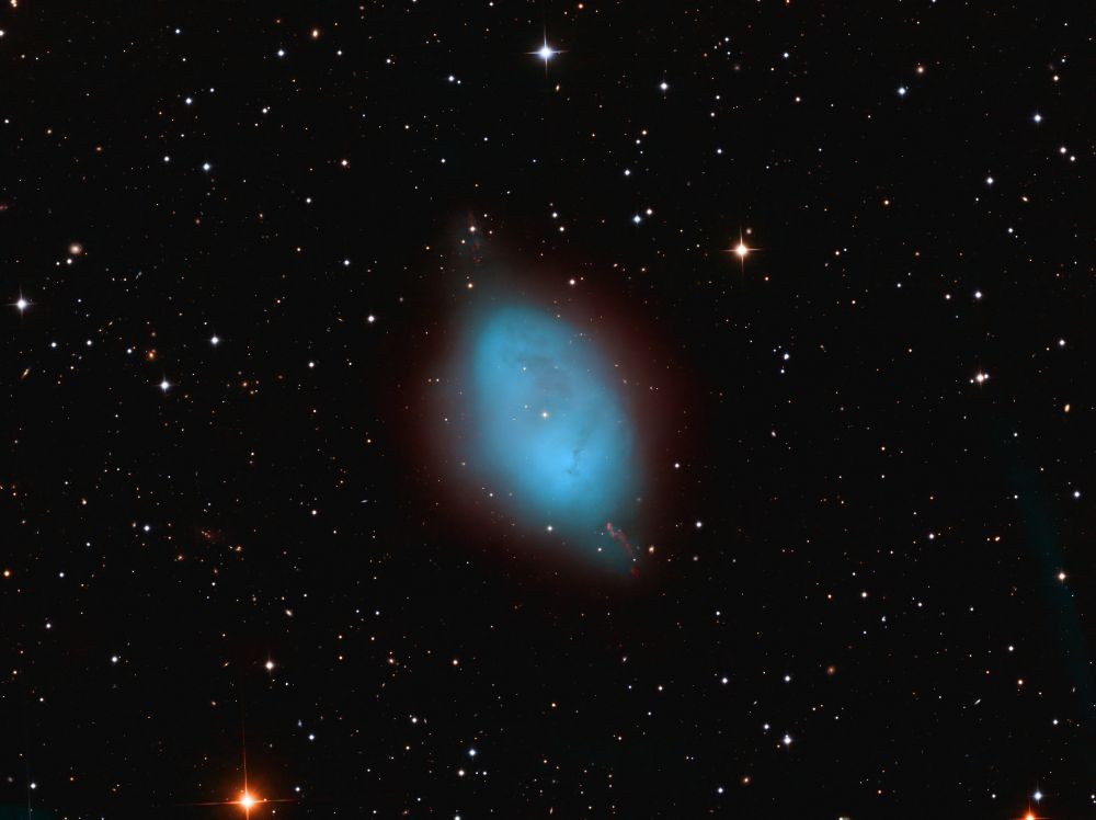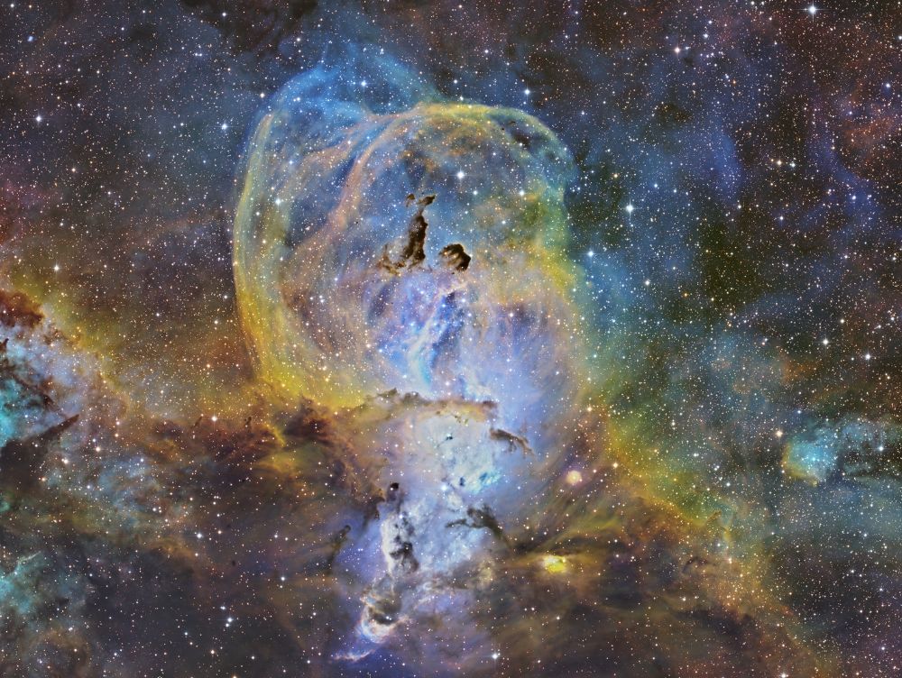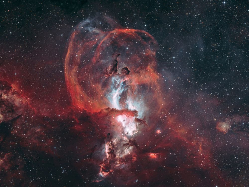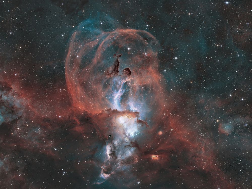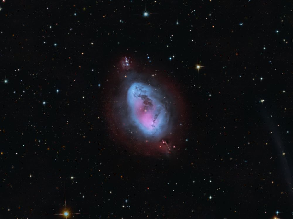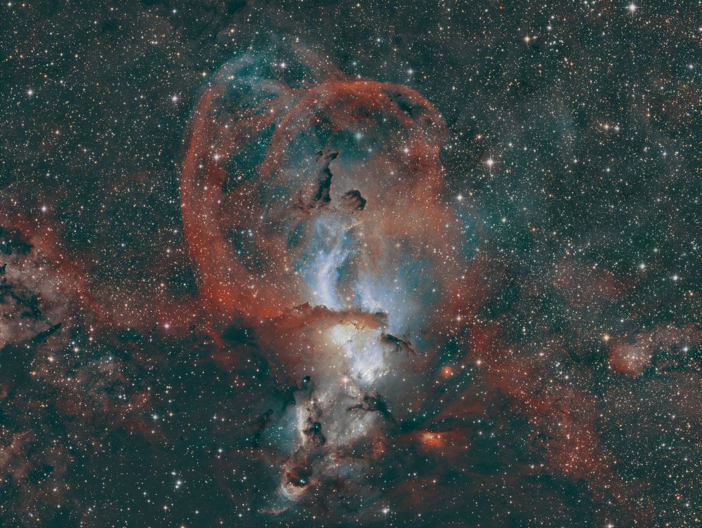 Nelle notti della prima settimana di Giugno, Federico ha realizzato una serie di riprese multibanda della famigerata nebulosa Aquila, al cui centro ci sono gli ancora più famosi Pilastri della Creazione, una struttura di gas ionizzato, polveri e giovani oggetti stellari immortalati decine di anni fa in una delle più celebri immagini del Telescopio Spaziale Hubble. Durante il montaggio dell’immagine in Hubble Palette (combinazione di riprese coi filtri SII, H-alpha e OIII) con stelle RGB, Federico si è accorto di uno strano oggetto in una delle due ali dell’Aquila, che in una sua precedente ripresa non aveva lo stesso aspetto (fig. 1).