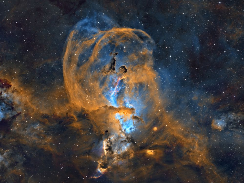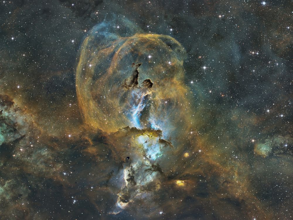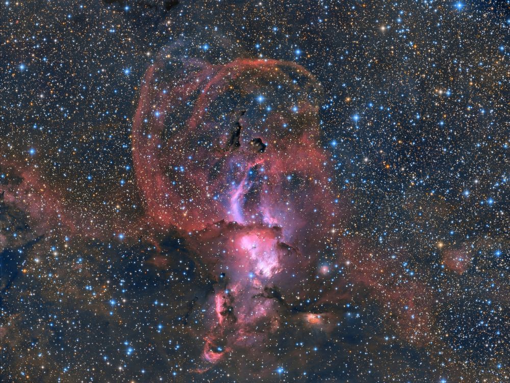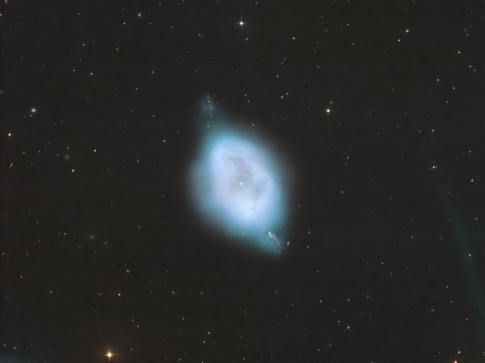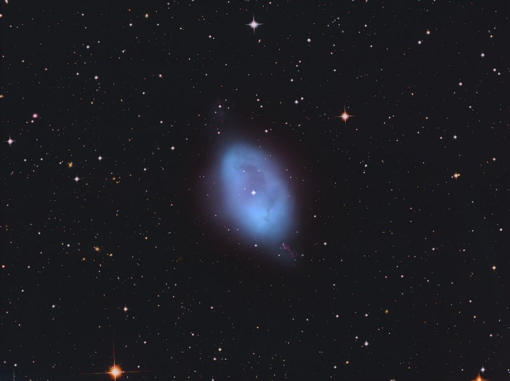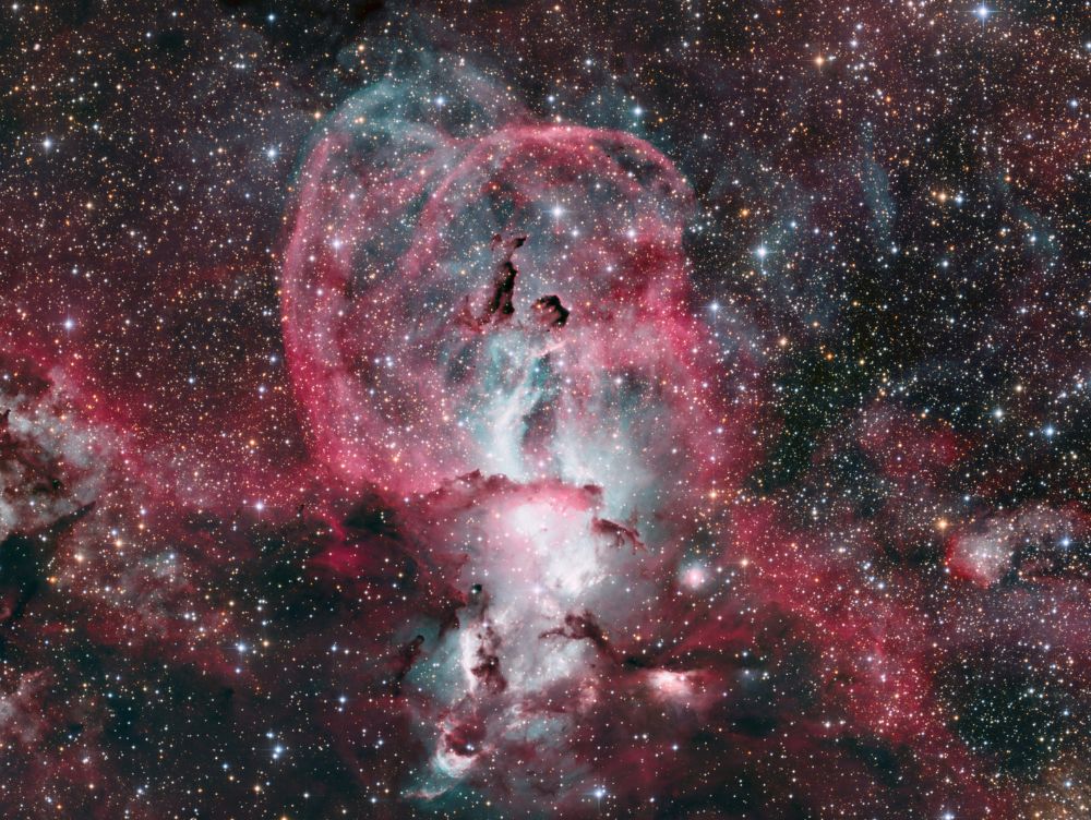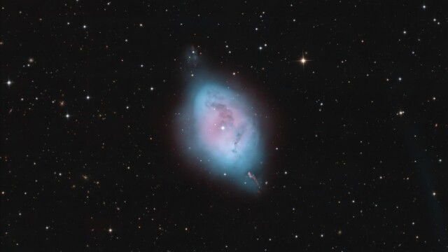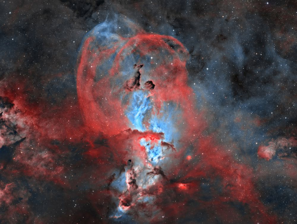 Nelle notti della prima settimana di Giugno, Federico ha realizzato una serie di riprese multibanda della famigerata nebulosa Aquila, al cui centro ci sono gli ancora più famosi Pilastri della Creazione, una struttura di gas ionizzato, polveri e giovani oggetti stellari immortalati decine di anni fa in una delle più celebri immagini del Telescopio Spaziale Hubble. Durante il montaggio dell’immagine in Hubble Palette (combinazione di riprese coi filtri SII, H-alpha e OIII) con stelle RGB, Federico si è accorto di uno strano oggetto in una delle due ali dell’Aquila, che in una sua precedente ripresa non aveva lo stesso aspetto (fig. 1).