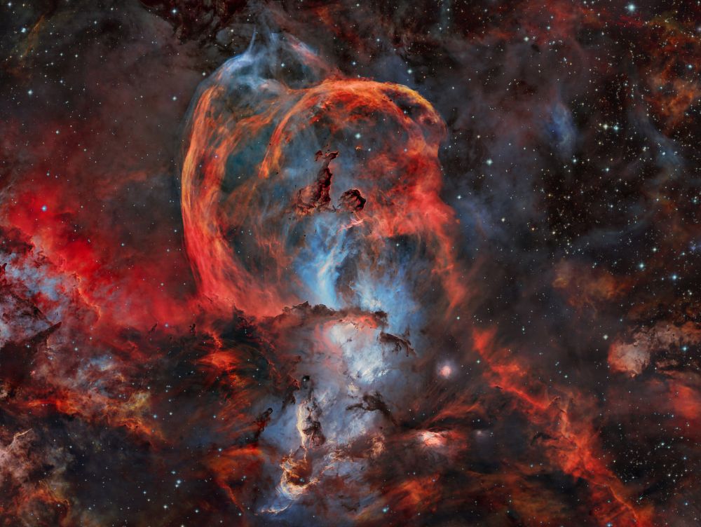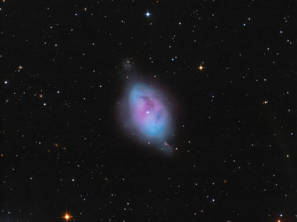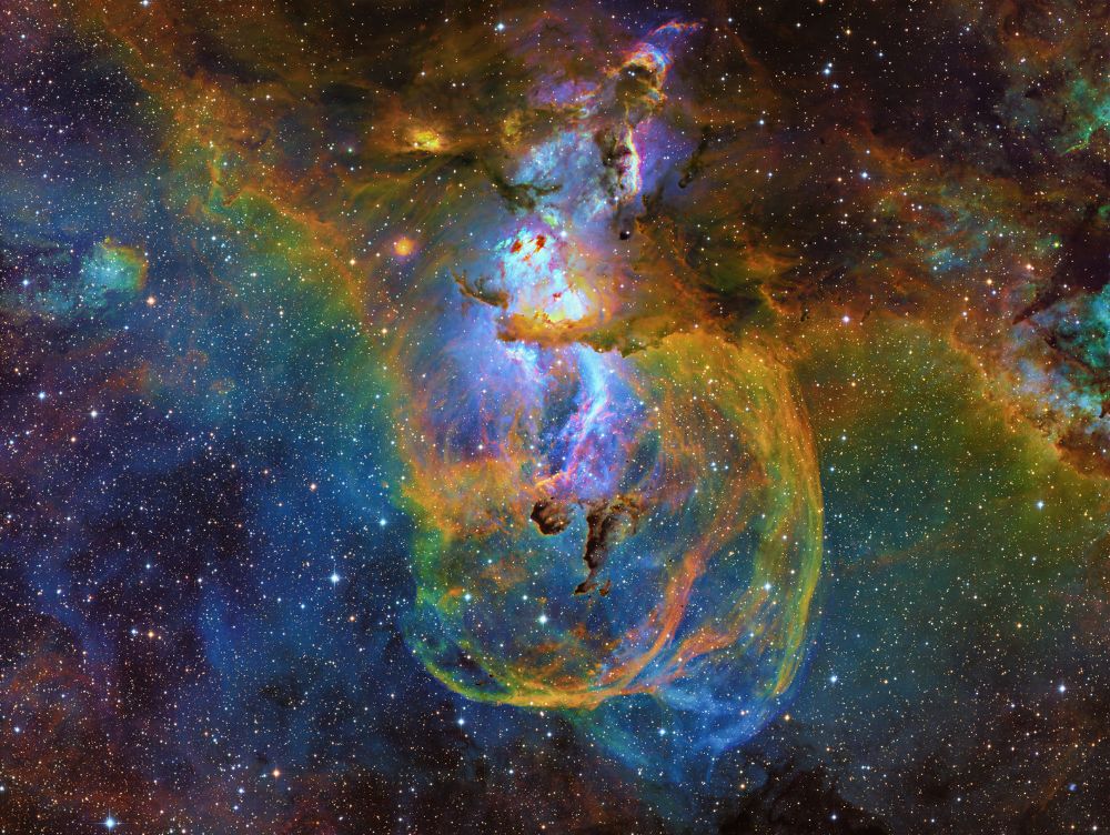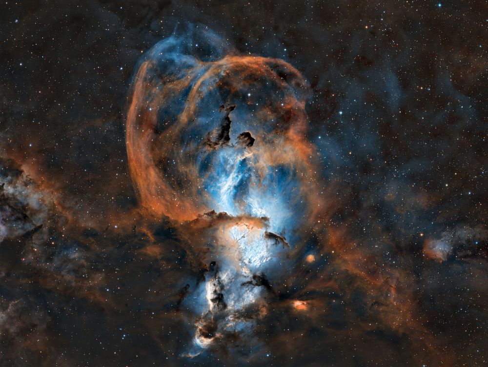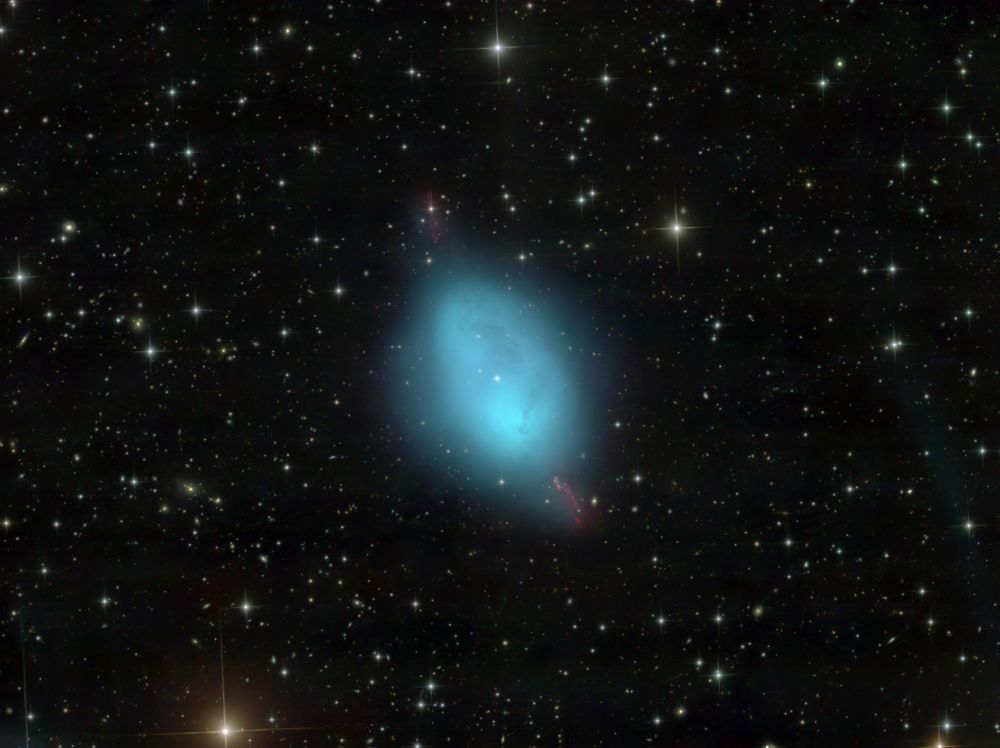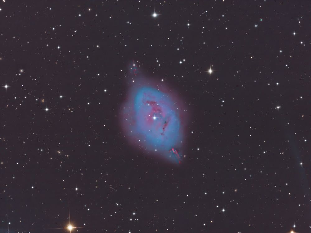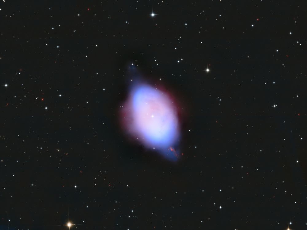 Nelle notti della prima settimana di Giugno, Federico ha realizzato una serie di riprese multibanda della famigerata nebulosa Aquila, al cui centro ci sono gli ancora più famosi Pilastri della Creazione, una struttura di gas ionizzato, polveri e giovani oggetti stellari immortalati decine di anni fa in una delle più celebri immagini del Telescopio Spaziale Hubble. Durante il montaggio dell’immagine in Hubble Palette (combinazione di riprese coi filtri SII, H-alpha e OIII) con stelle RGB, Federico si è accorto di uno strano oggetto in una delle due ali dell’Aquila, che in una sua precedente ripresa non aveva lo stesso aspetto (fig. 1).
