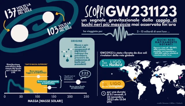 2. I buchi neri supermassicci – con masse milioni di volte quella solare, ordine 106M⊙ – si trovano solitamente al centro delle galassie. Allo stato attuale dell’arte non c’è una perfetta comprensione sui meccanismi che li hanno generati, ma si pensa che i buchi neri supermassicci possano avere origine da diversi buchi neri stellari che nel corso del tempo si sono fusi insieme.