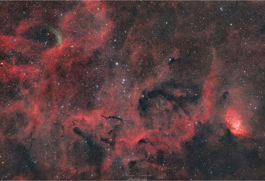 Composizione SHO di Federico Vittorio Mantovani con scatti realizzati la sera del 29 giugno 2025 con Sky-Watcher 300mm/1200mm e ASI2600MM per un totale di 19 ore di integrazione. Nel riquadro in basso a sinistra è evidenziato l’oggetto che ha fatto scattare la scintilla. A destra nei due cerchi l'area compresa nel mirino a sinistra ingrandita come si mostrava nello scatto di Mantovani nel 2023 e come è apparsa nel 2025.