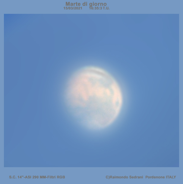 Marte di giorno di Raimondo Sedrani. Un bellissimo Marte ripreso in diurna, per tutte le informazioni di ripresa clicca sull'immagine! Crediti: Coelum Astronomia Raimondo Sedrani