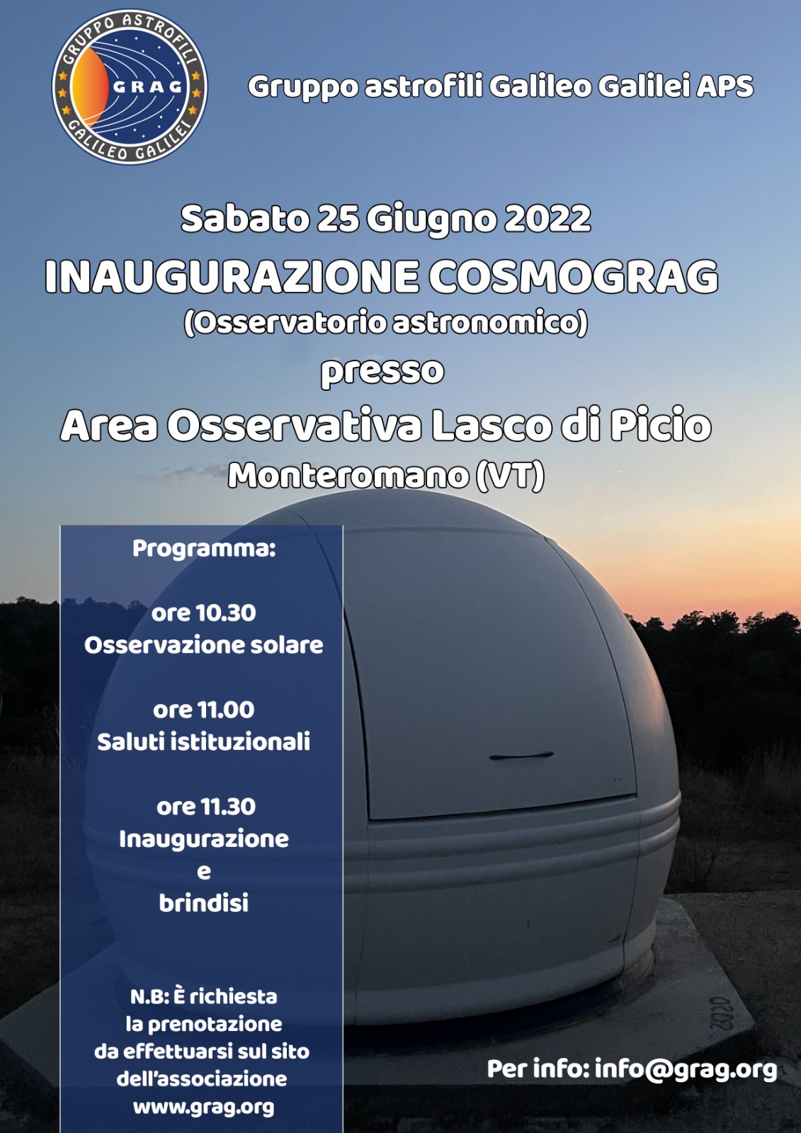 ll GrAG – Gruppo Astrofili Galileo Galilei di Tarquinia ha il piacere di annunciare l’inaugurazione dell’osservatorio astronomico CosmoGrAG, il 25 giugno 2022