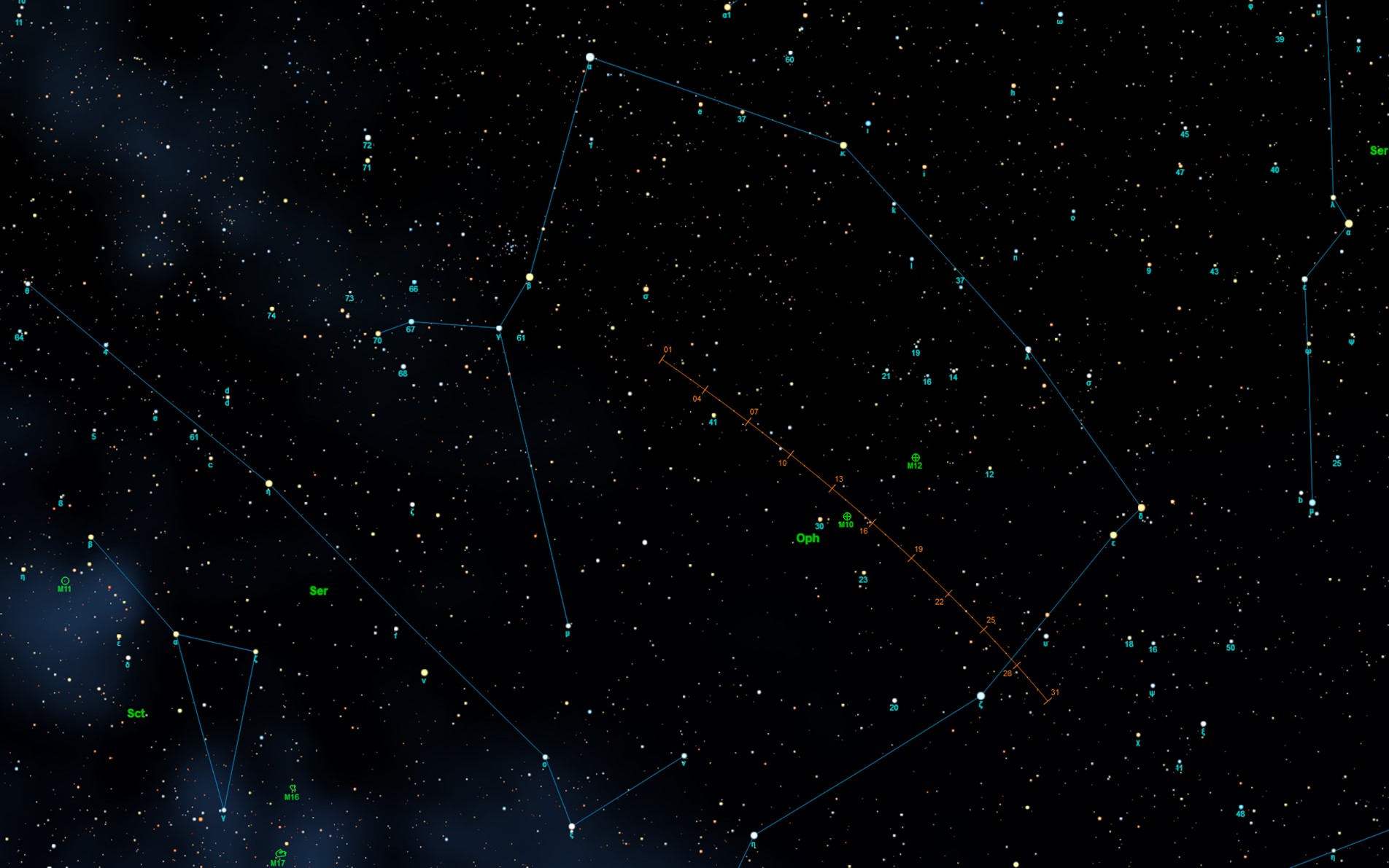 Sarà ancora l’Ofiuco il palcoscenico celeste in cui si muoverà la cometa, che calerà in declinazione. Il giorno 15 transiterà a circa mezzo grado dal luminoso ammasso globulare M10, di mag. 6,5: occasione imperdibile per un’osservazione particolare o una foto suggestiva!
