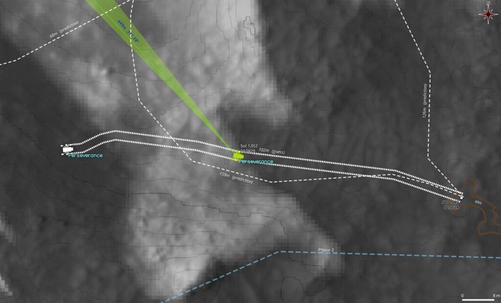 Il 4 febbraio, Sol 1052, Perseverance riprende a spostarsi verso ovest. È un movimento che al momento non è ancora stato inserito nella mappa ma che alcuni appassionati sono riusciti a ricostruire, trovando conferma delle analisi altimetriche che avevano previsto l’esistenza di aree di visibilità non troppo lontane dalla posizione da cui la panoramica era stata scattata.
