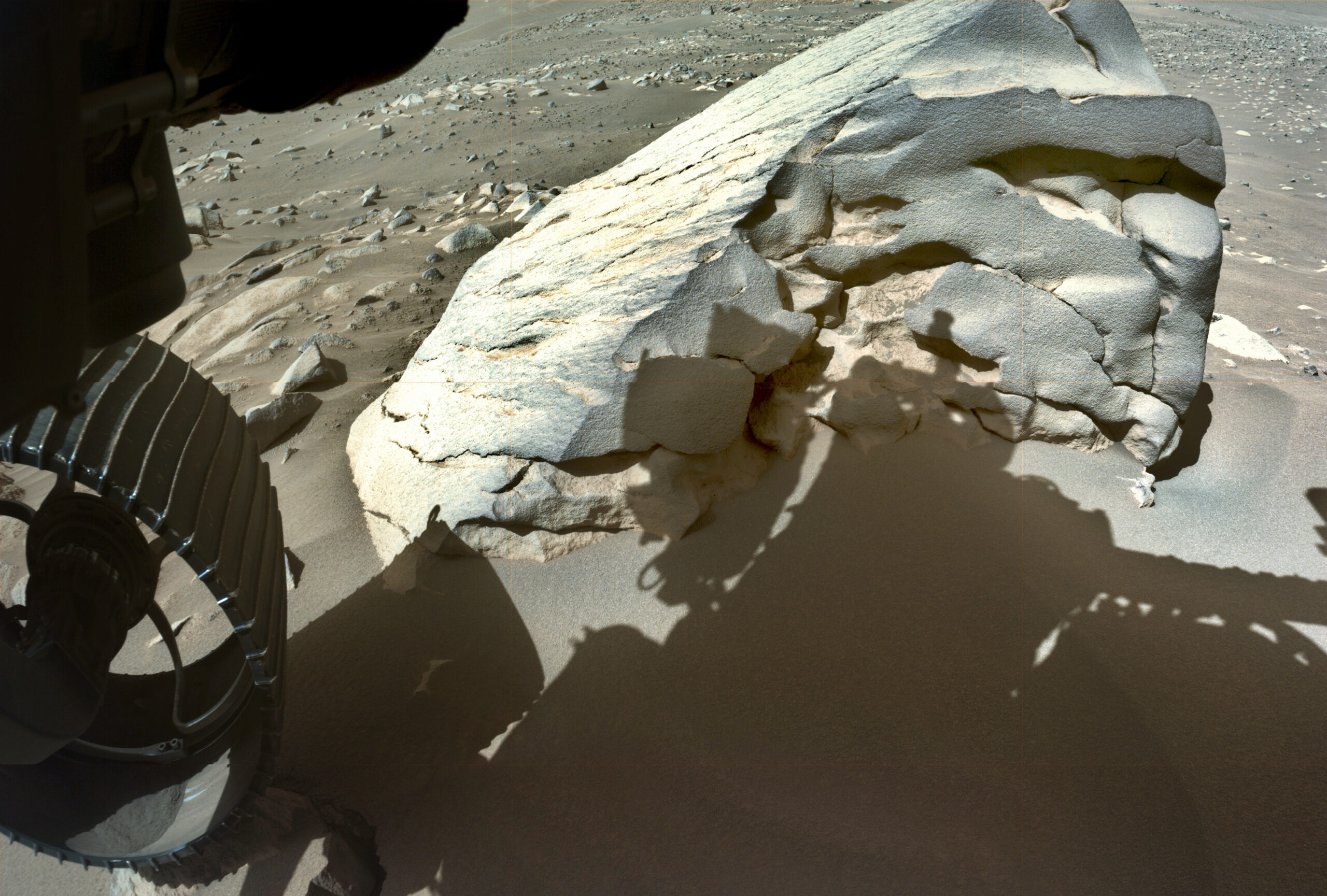 La spiegazione formulata da Steve Ruff, geologo planetario dell’Arizona State University, è che questa superficie fosse un tempo parte di una frattura e di un affioramento prima di essere consumata dal vento e ridotta ora a questo masso. I granelli di sabbia intrappolati all’interno della frattura si sarebbero cementati venendo inclusi nella roccia, forse grazie agli stessi sali che attualmente formano concrezioni, sebbene molto meno solide, nella sabbia. Abbiamo un esempio di questo particolare fenomeno grazie a un sasso che le ruote di Perseverance hanno smosso durante l’avvicinamento a Bunsen Peak.