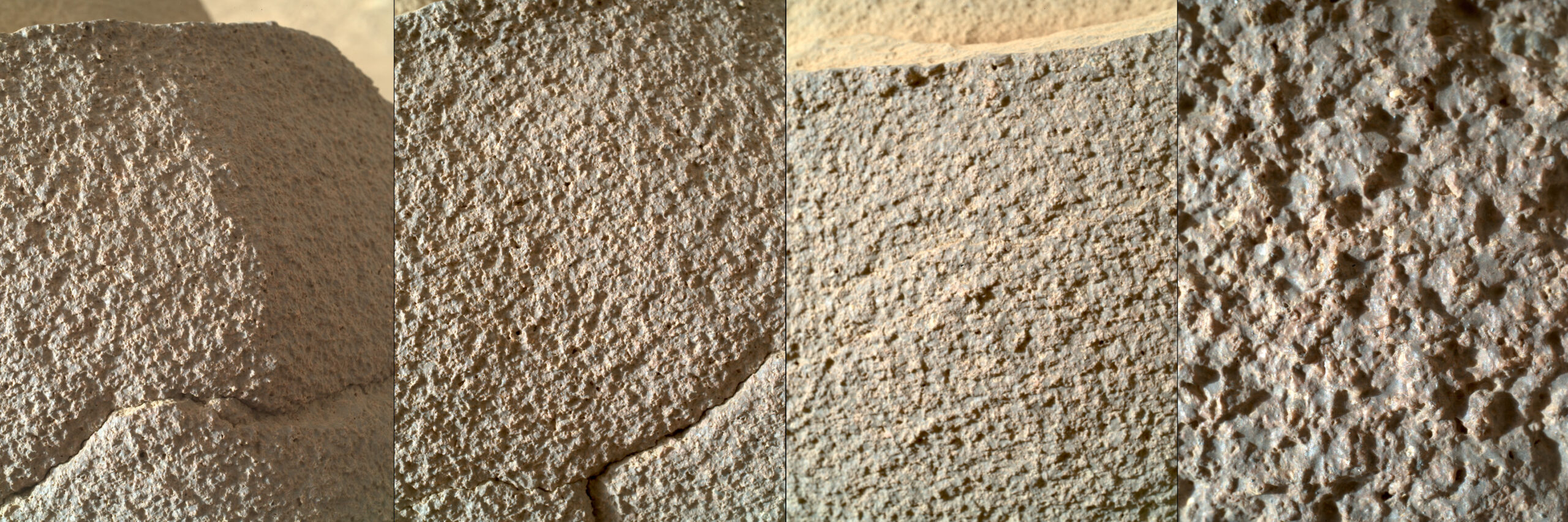 Le indagini proseguono e nel Sol 1071 il rover inizia osservazioni davvero ravvicinate. È il momento di mettere in azione la camera WATSON, ospitata in cima al braccio robotico, che permette macro estremamente dettagliate. Perseverance esegue una serie di acquisizioni a distanza variabile mettendo in evidenza la struttura superficiale della roccia oggetto d’indagine.