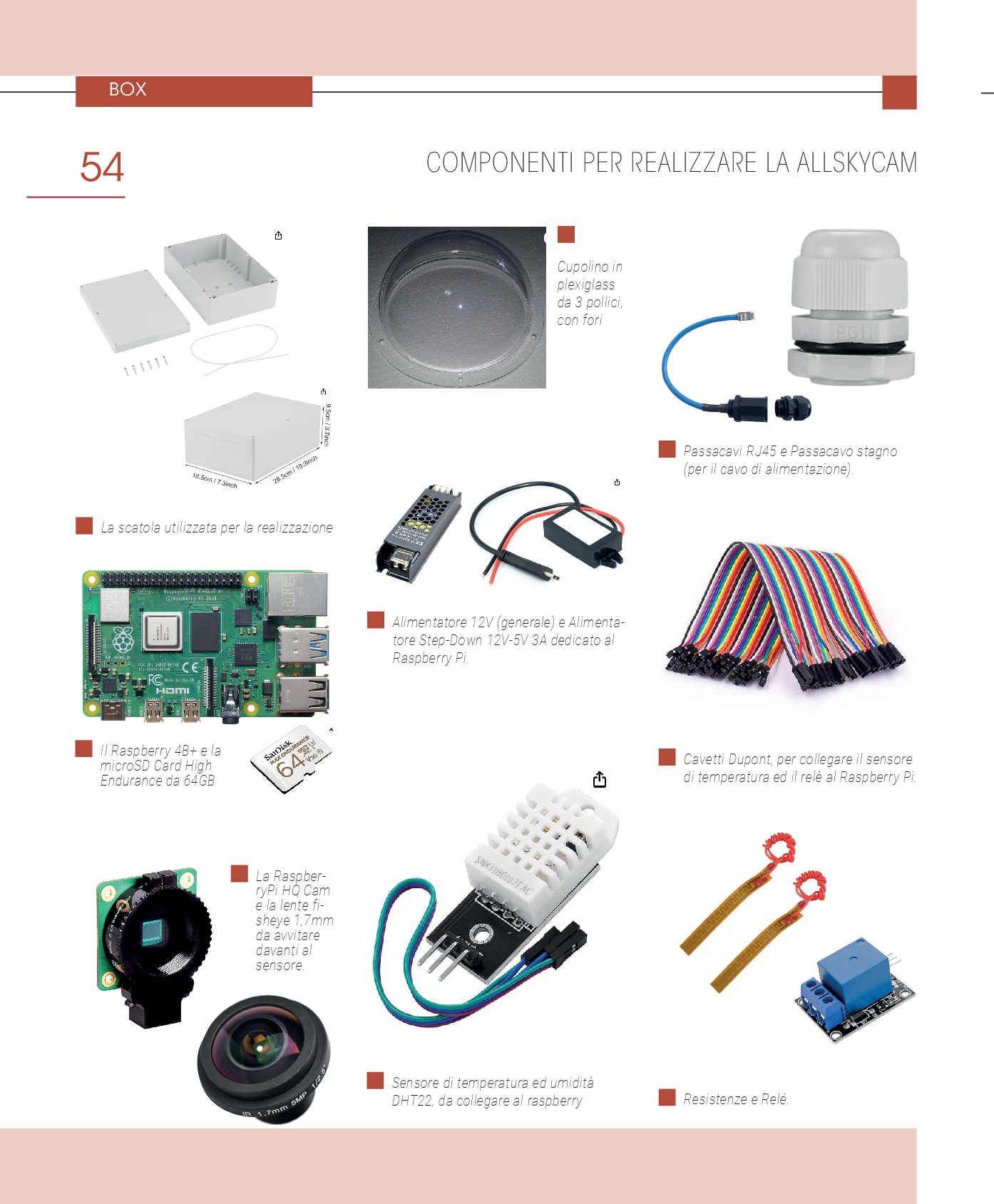 Per il software, si è scelto frankAllSkyCam, un programma gratuito e leggero che fornisce funzionalità essenziali come gli orari di alba e tramonto, le fasi lunari, umidità e temperatura. La costruzione richiede componenti come un Raspberry Pi4, una scheda micro-SD ad alte prestazioni, una camera Pi HQ Cam, una lente fish-eye, resistenze anticondensa, un relè, un sensore di temperatura e umidità, una scatola stagna, un alimentatore e vari cavi e connettori.