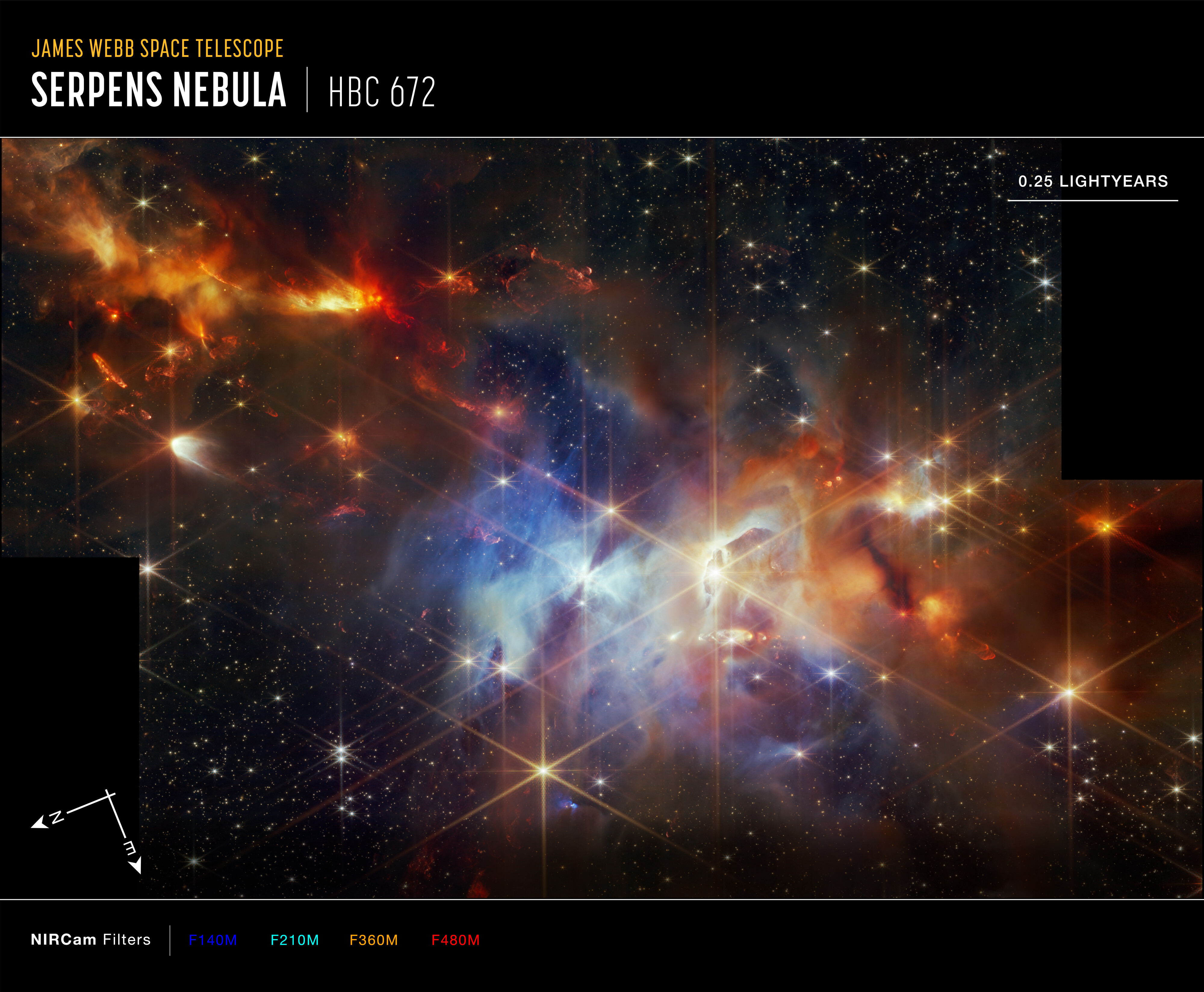 Per la prima volta, un fenomeno che gli astronomi speravano da tempo di poter fotografare direttamente è stato catturato dalla Near-InfraRed Camera (NIRCam) del James Webb Space Telescope della NASA/ESA/CSA. In questa splendida immagine della Nebulosa Serpente, la scoperta si trova nella zona settentrionale di questa giovane e vicina regione di formazione stellare.