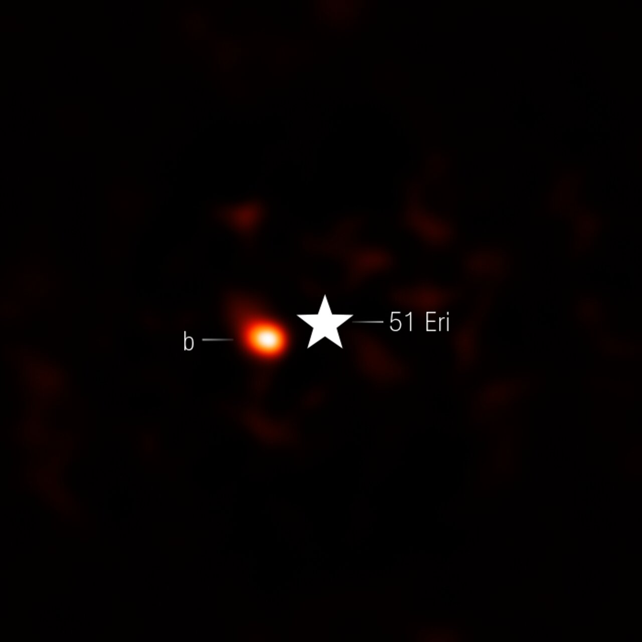 Il sistema 51 Eridani si trova a 96 anni luce dalla Terra. L’immagine utilizza filtri che rappresentano la luce a 4,1 micron con il colore rosso. NASA, ESA, CSA, STScI, W. Balmer (JHU), L. Pueyo (STScI), M. Perrin (STScI)