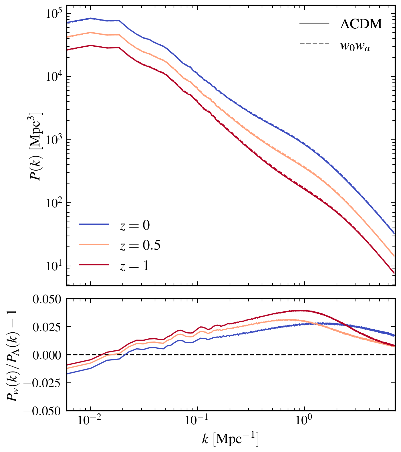 In alto: confronto degli spettri di potenza della materia ottenuti nelle due simulazioni: linea continua per il modello ΛCDM, linea tratteggiata per il modello w₀wₐCDM, mostrati a tre diverse epoche cosmiche: z = 0 (colore blu), z = 0.5 (rosa) e z = 1 (rosso).