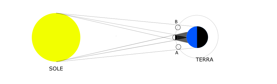 Terza condizione, che si evince dalla Figura 3, è che la Luna deve trovarsi compresa tra i punti A e B, altrimenti non verrà proiettato alcun cono d’ombra sulla Terra.