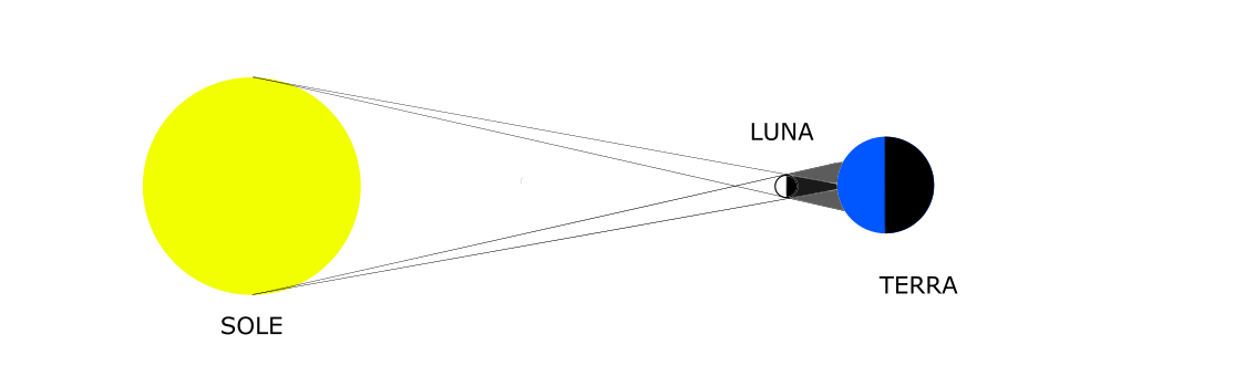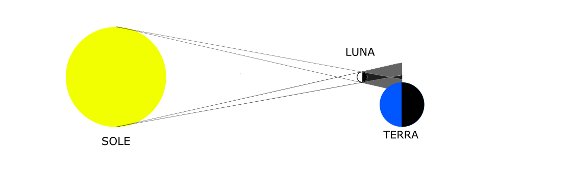 Dalla Figura 1 si evince come la regione della Terra che rientra nel cono d’ombra vedrà il Sole completamente eclissato, mentre l’area circostante sarà in penombra. Il cono d’ombra e quello di penombra si sposteranno con il trascorrere del tempo, rendendo il fenomeno visibile in punti diversi della Terra in momenti differenti. Questa è un’eclissi totale.