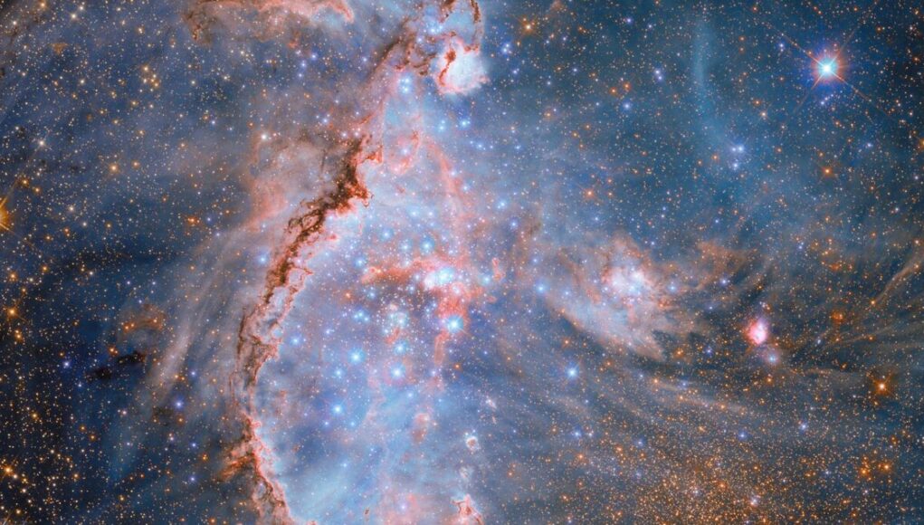 NGC 346 ospita più di 2500 stelle neonate, molte delle quali estremamente massicce e luminose. Nell’immagine si distinguono per la loro intensa luce blu, mentre la nube rosa incandescente e le scie scure serpeggianti indicano la presenza di polveri residue dal processo di formazione stellare.