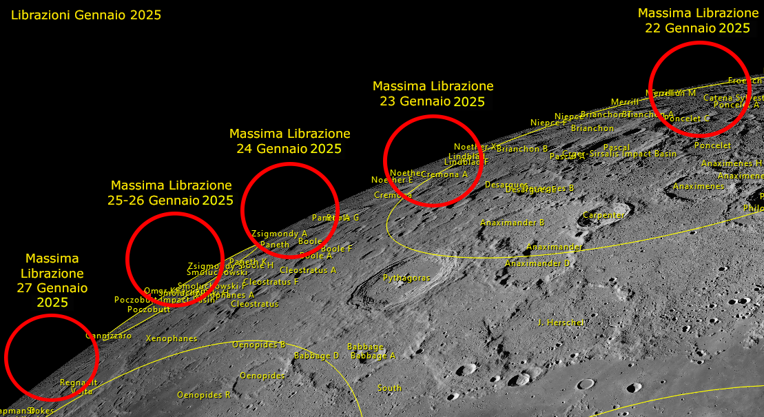 - 22 Gennaio: Massima Librazione a nord cratere Anaximenes, Regione polare settentrionale.