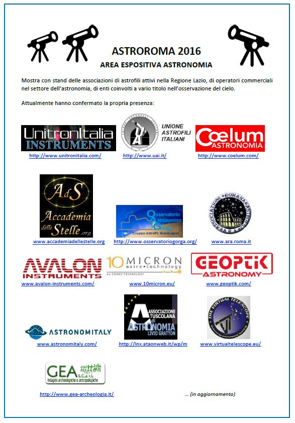 …e ancora a partire dalle 19.45 del venerdì, fino alle 19 della domenica: conferenze scientifiche divulgative, laboratori per grandi e piccoli, seminari tecnici per astrofili, osservazioni del Sole e del cielo a cura di INAF, UAI, Accademia delle Stelle, ARA-‐Associazione Romana Astrofili, AstronomiAmo, Gruppo Astrofili Monti Lepini, Virtual Telescope, Università Roma 3 e presso gli stand dei partecipanti di ASTROROMA.