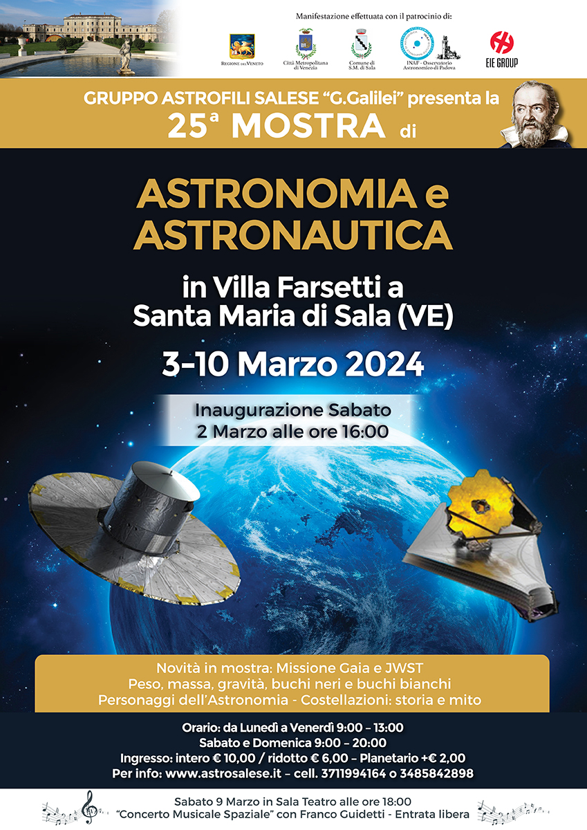 Lo ha detto Tino Testolina, presidente del Gruppo Astrofili Salese “G. Galilei”, illustrando il programma e le novità della “25^ Mostra di Astronomia e Astronautica”, che si terrà a Villa Farsetti di Santa Maria di Sala dal 3 al 10 Marzo 2024, con inaugurazione il giorno 2 Marzo alle ore 16.00.