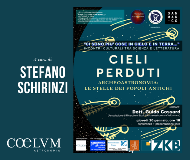 Grande appuntamento per i cultori della storia dell’Astronomia. Giovedì 20 Gennaio a Trieste: il Prof. Guido Cossard dell’Associazione di Ricerche e Studi di Archeastronomia Valdostana sarà protagonista di un incontro presso l’Antico Caffè San Marco (Via C. Battisti, 18 a Trieste) nell’ambito del ciclo di appuntamenti didattici “Ci sono più cose in cielo e in terra…”, organizzato dal Centro Studi Astronomici Antares Trieste assieme al prestigioso “Antico Caffè San Marco”.