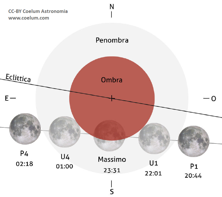 La fase massima di questa eclisse si verificherà alle 23:31 mentre il termine della fase Parziale (U4) è previsto per le 01:00 della notte seguente.