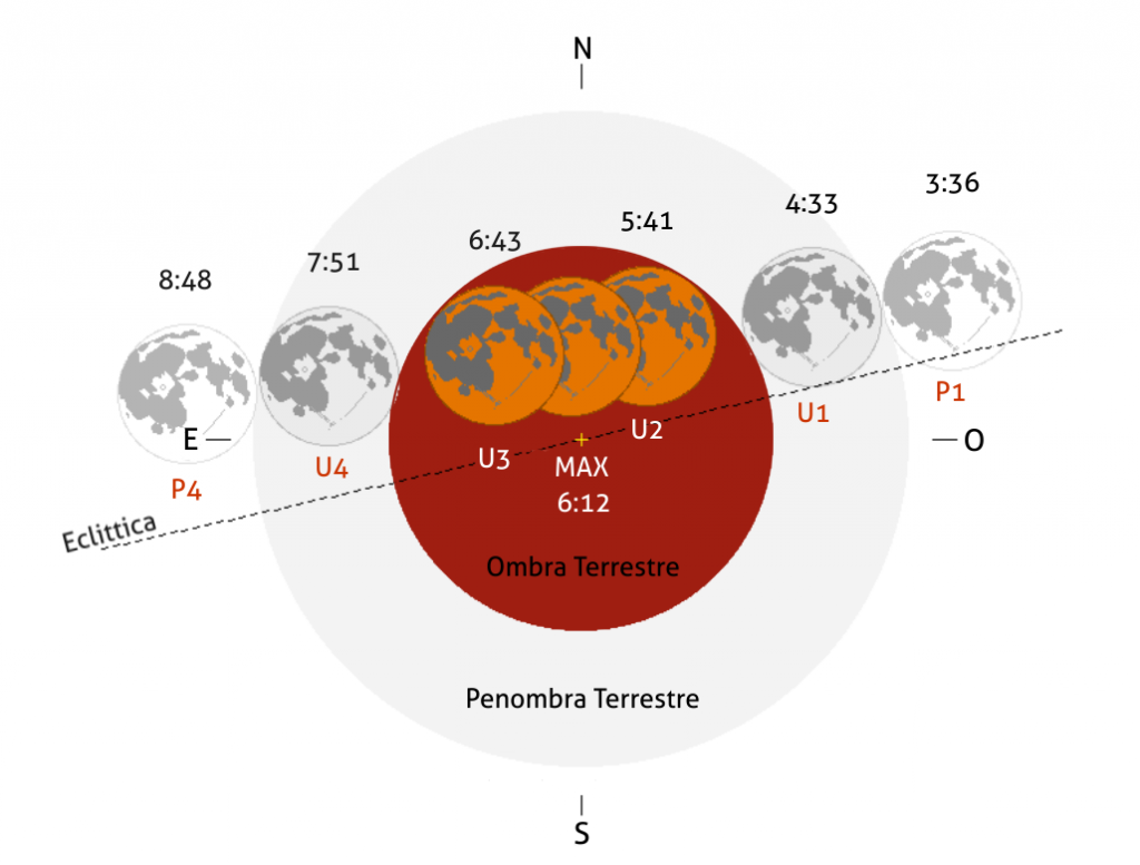 Per quanto riguarda il nostro Paese, basterà guardare in direzione ovest-nordovest. E’ utile precisare che la fase iniziale del fenomeno, prevista per le 03:36, potrà essere seguita da tutte le località italiane anche se le estreme aree meridionali potranno essere parzialmente penalizzate da una minore altezza della Luna.
