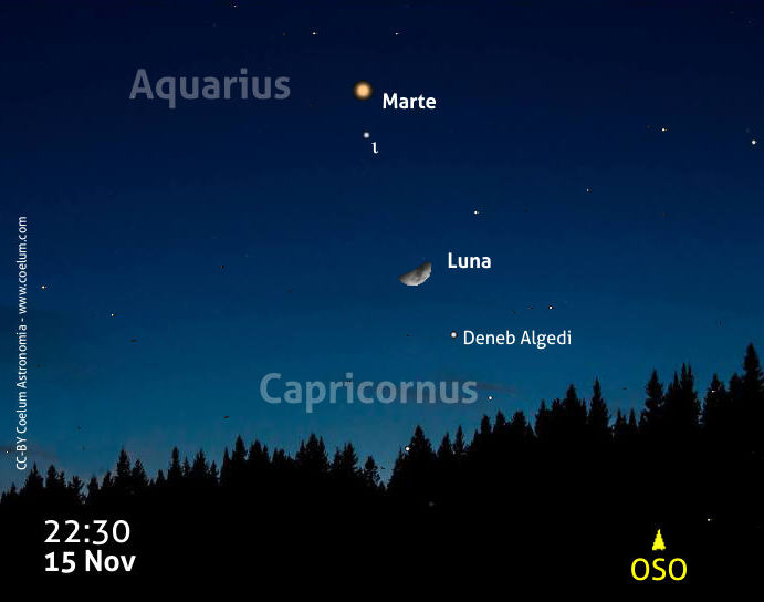 Dopo la congiunzione tra Venere e Spica del mattino del 15 novembre, la sera, guardando verso sudovest, sarà invece possibile ammirare una congiunzione piuttosto larga tra la Luna (fase 52%), alta circa 10°, e il pianeta Marte (mag. –0,3), posto a 4,4° a nordest della Luna.