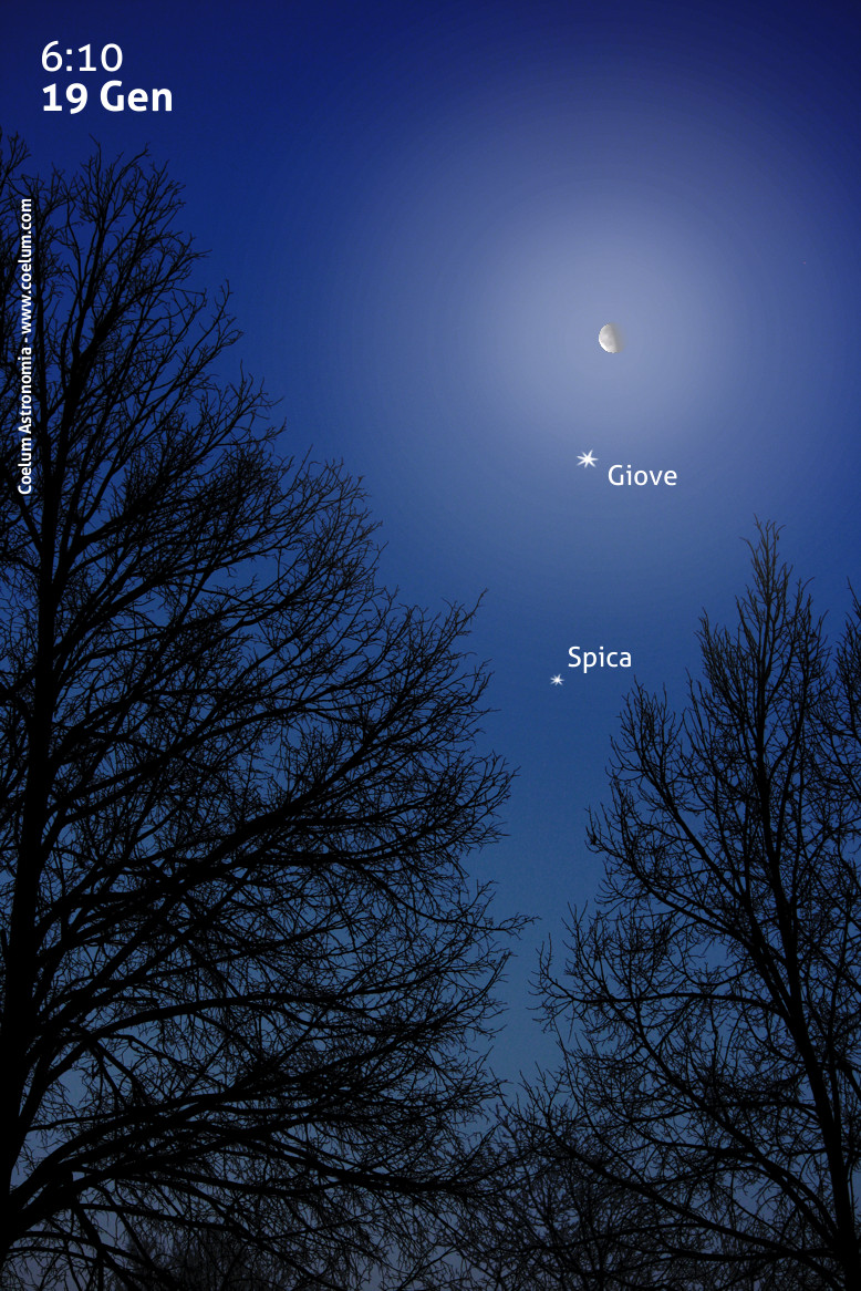 Ecco una bella congiunzione tra la Luna all’Ultimo Quarto, Giove (mag. –2,1) e la stella Spica (mag. +1,1), visibili nella costellazione della Vergine.
