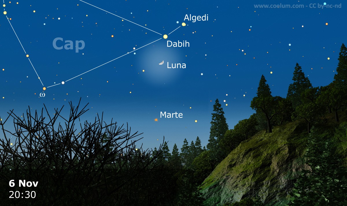 6 novembre, ore 20:30: un allineamento verticale sull'orizzonte sudovest di Luna, Marte e la stella Dabih. Per esigenze grafiche la Luna è ingrandita.