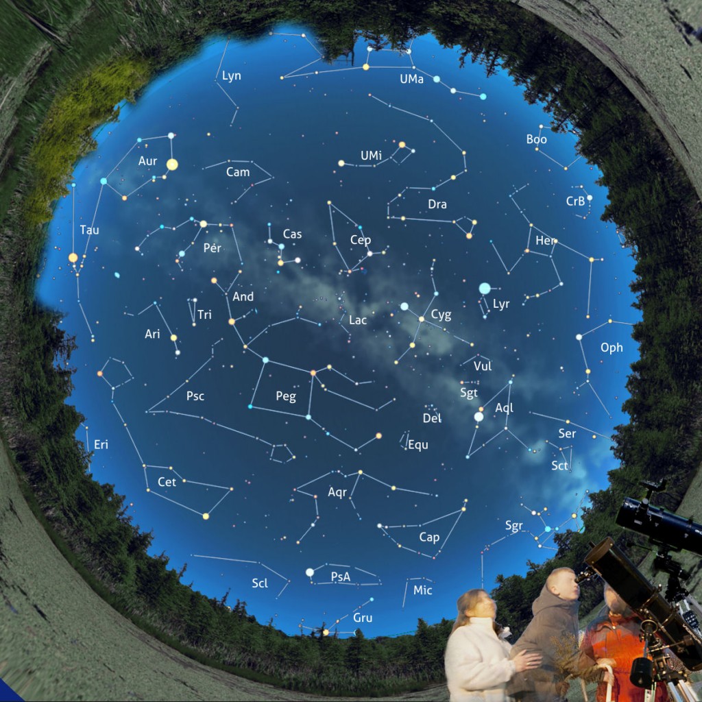 Il Boote ed Ercole saranno già al tramonto, mentre a nordest si potrà seguire l’ascesa della coppia Perseo- Cassiopea, con la caratteristica forma a “W”, e il sorgere della brillantissima Capella con l’Auriga. A seguire potremo notare le stelle del Toro, che assieme alle Pleiadi rappresentano le avanguardie del cielo invernale. Questo scenario vedrà il suo completamento con il sorgere di Orione e dei Gemelli nella seconda parte della notte. Sull’orizzonte nord, l’asterismo del Grande Carro si troverà al punto più basso del suo percorso attorno alla stella Polare.