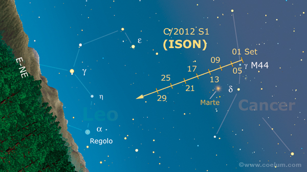 L’americano Bruce Gray, un amatore dell’Arizona, è invece riuscito a catturare la flebile immagine della cometa già il 12 agosto, con almeno due settimane di anticipo, riprendendola all’alba quando era alta soltanto +6° sull’orizzonte. L’essere riusciti a scorgerla così presto non sta purtroppo a significare che la ISON sia improvvisamente aumentata di splendore.
