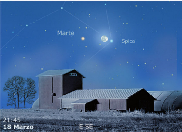 Come avviene da ormai tre mesi a intervalli di una lunazione, il nostro satellite darà vita a una bella congiunzione con Spica e Marte, che questa volta potrà essere seguito a partire dalle 21:30 del 18 marzo. All’ora indicata nella illustrazione (in orientamento altazimutale) i tre oggetti saranno alti circa +12° sull’orizzonte di est-sudest, con la Luna situata 1,2° da Spica e 4° da Marte.
