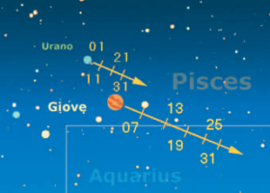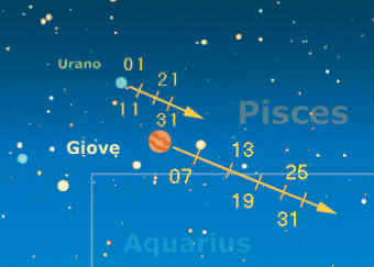 Anche in ottobre Urano e Giove si troveranno a condividere la stessa zona di cielo, situata al confine sudovest dei Pesci con l’Acquario. A inizio mese la distanza angolaretra i due pianeti sarà di 1,6° per poi crescere fino ai 3,2° degli ultimi giorni di ottobre.Ma il 2 gennaio prossimo – come abbiamo scritto lo scorso numero – la vicinanza conGiove potrebbe aiutare moltissimo eventuali osservatori desiderosi di riuscire a individuareUrano (mag. +5,7) a occhio nudo!