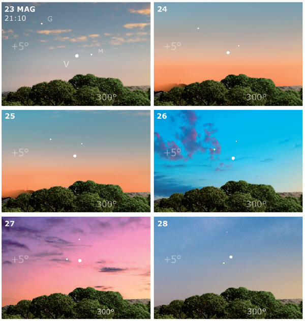 Dal 23 al 28 maggio, i riquadri descrivono ogni due giorni le posizioni dei pianeti come apparirebbero a un osservatore ad occhio nudo che, in quelle sere, guardasse verso ovest appena dopo il tramonto (l’orario prescelto è all’incirca quello delle 21:10, quando il Sole sarà sotto l’orizzonte di 6°). Come si può vedere, il 26 i tre pianeti assumeranno la formazione di un triangolo (quasi) equilatero, con Venere distante 1,8° da Mercurio e 2,2° da Giove, e Mercurio 2,5° distante da Giove. Considerando i massimi reciproci avvicinamenti, il 27 Venere sarà 1,3° a sud di Mercurio, mentre il 28 sarà 1° a nordovest di Giove (tutto in riferimento altazimutale).