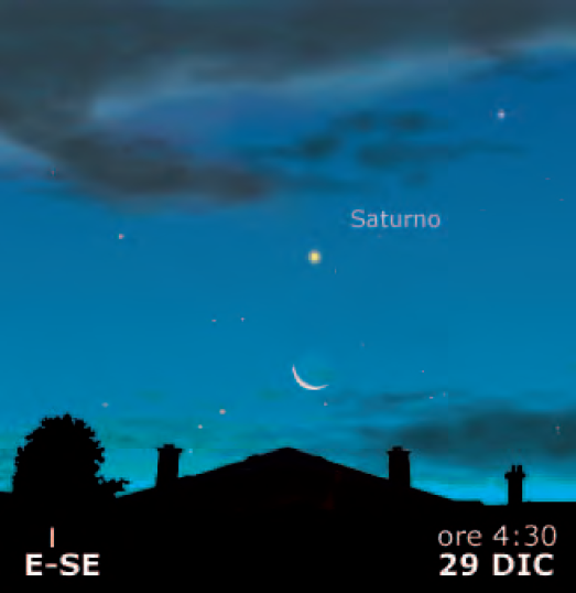 Dopo le 4:00 del mattino del 29 dicembre, sarà possibile assistere al sorgere di una falce lunare molto più sottile posizionata 2,5° a sudest di Saturno (orientamento equatoriale). Ed è proprio con questa congiunzione larga che si concluderà l’anno astronomico 2013.
